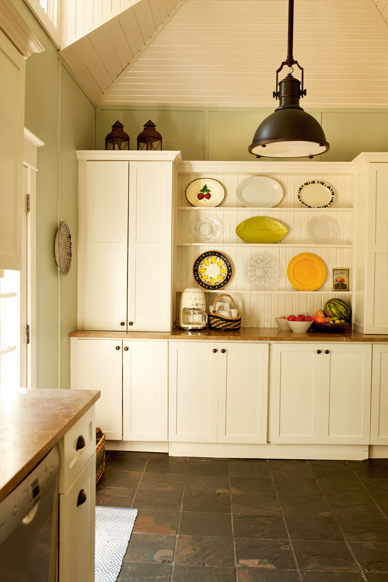 The Turnbulls got to work de-frogging the five-bedroom, two-bathroom cottage, with Bryn, her brother, Alec, and her sister, Hayley, pitching in. “My siblings and I were taught to use paintbrushes at a very young age,” says Bryn. The family swapped the green shag carpeting with antique elm hardwood and redid the kitchen with a more efficient layout, adding new slate tile flooring, plus updated cabinetry and appliances. Since the cottage came fully furnished, the family repaired and refinished a few pieces, stripping off the old paint and reviving the original wood of several bookcases, desks, and side tables.