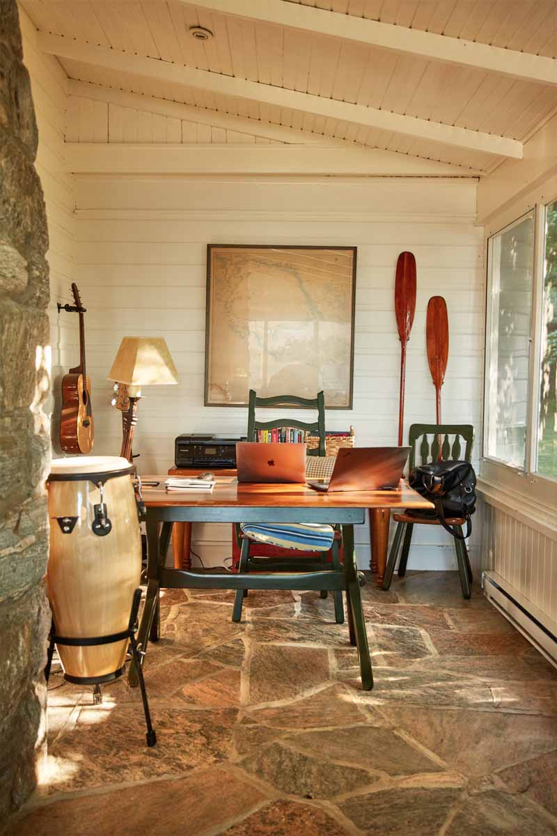 Calling back to earlier eras is something Bryn, an internationally acclaimed author of four bestselling historical fiction novels, is quite familiar with. “I do my best writing at the cottage,” she says. Her office is set up at the end of the screened-in porch, an idyllic spot with picturesque views of Georgian Bay, the occasional stream of late-afternoon sunlight, and rustic granite floors (inspired by the cottage’s stone facade and indoor fireplace).