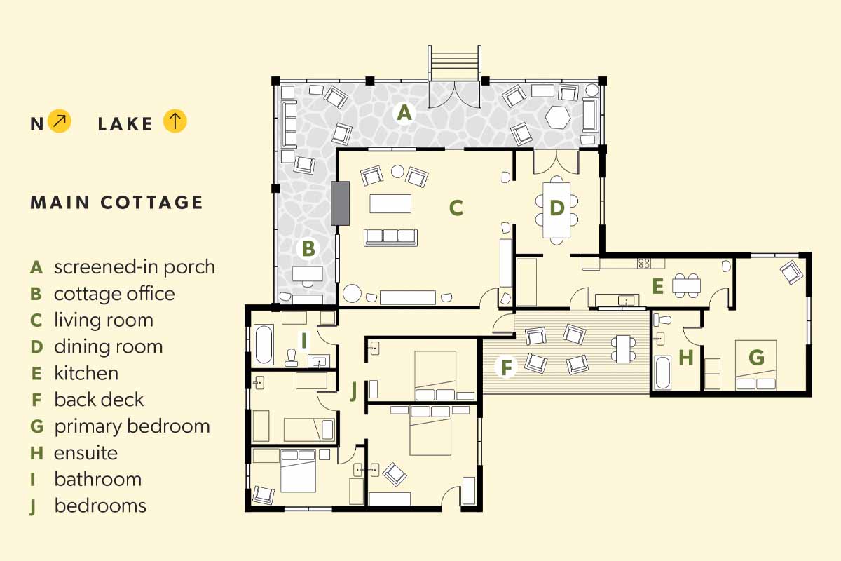 Because of the cottage’s age, Bryn and her family didn’t just inherit the space, but also its storied past. Originally, the cottage was part of a larger property with three main cabins (one of which was Bryn’s grandparents’ cottage) and three additional outbuildings. An executive for a popular North American department store was the owner of the estate, lore says. “Apparently, he’d bring his whole family and stay here for the summers,” says Bryn. Also on the guest list were the family’s doctor and priest.
