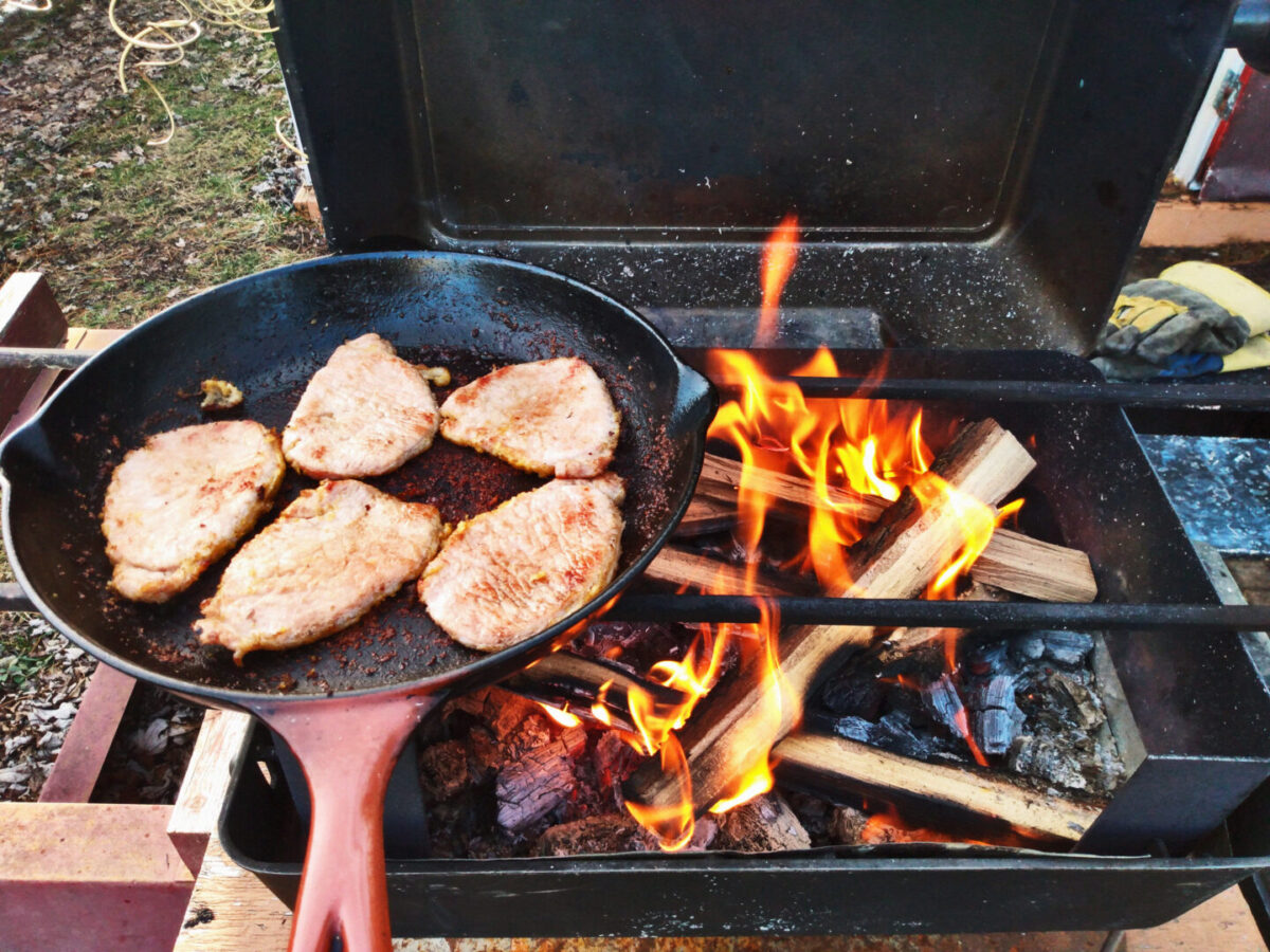Paul got this idea after he scrapped two barbecues and then another one failed him. “I didn’t want to be more wasteful,” he says. Fill the inside with wood on top of the cookie sheet, fire it up, and then place your skillet or cast-iron pan on the grills directly above the flames. No fuel or propane needed—just wood and fire. “It’s an enjoyable way to cook, great for nights when you only want a small campfire—you get the full experience without all the fuss.”