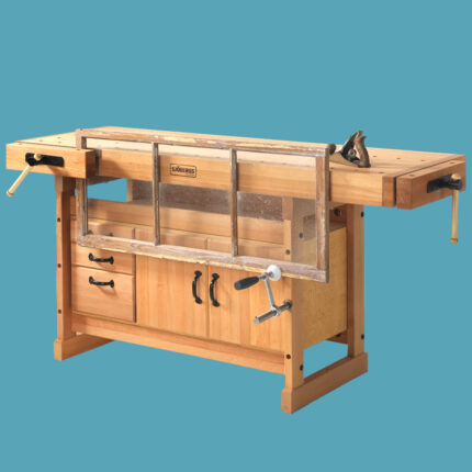This sweet, solid beech workbench will be coveted by all the woodworkers on the lake. It features two vises and double rows of holes for bench dogs, holdfasts, anvils, and other accessories