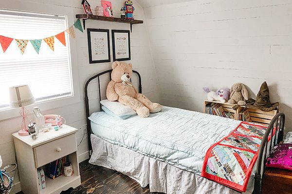 Our oldest two kids have large, identical loft bedrooms upstairs, which are both accessed by loft ladders. Our new baby, Jack, was a bit of a surprise, but we don’t plan to add any more square footage to the house. He is room sharing with us for now until he is old enough to room share with one of his siblings.”