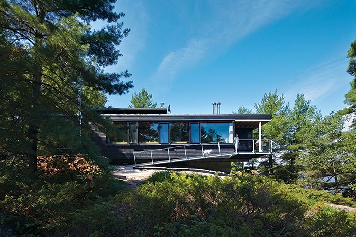 At one spot, the steel crossbeam of the large front deck sits perfectly flush with the knob of the Canadian Shield on which the whole structure stands, allowing a simple half-step from deck to ancient rock and making a seamless transition from built to natural environment. “It’s Planet Earth,” Ian MacDonald says. “You should work with it.” This cozy fit of rock and steel is one of his favourite features, testament to the care he took to avoid levelling the lot or otherwise rearranging the landscape to fit the design. The building perches lightly on top of the rock on eight concrete piers pinned directly into the rock.