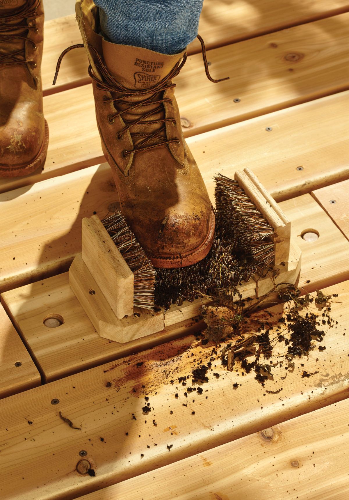 5. Flip the base over. Glue and screw the two brush halves to the middle. Screw the side brushes to 2 1/2″ x 5″ spacer pieces, cut from 5/4 deck boards. Glue and screw these assemblies to the base. Drop the boot brush over the dowels, ready for duty. When you flip it over, most of the dirt will fall to the ground below. Now, you can go back inside, maybe even with your boots on.
