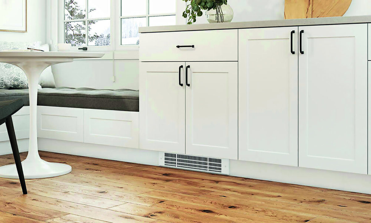 In a cottage great room, especially one with floor-to-ceiling windows, wall space for conventional baseboard heaters can be limited. Floor-insert fan-forced heaters, which look like forced-air floor registers, push heated air up from floor level and circulate it through the space. They’re unobtrusive and can be located in front of windows or elsewhere in the room—anywhere you can hardwire them.