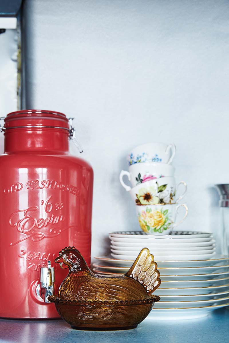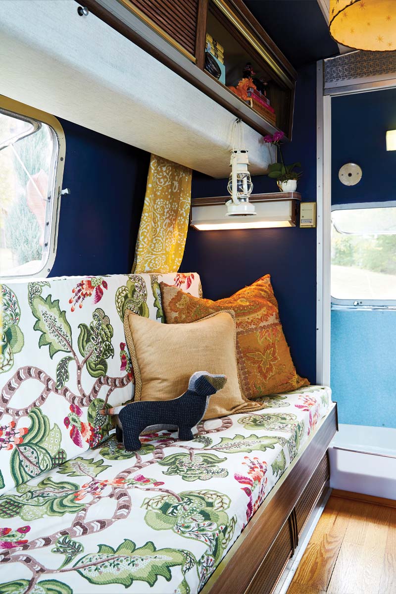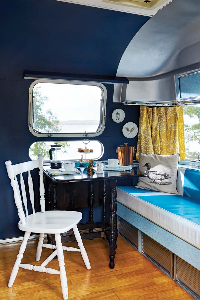 Though the Airstream lived past lives before the couple bought it—winning Best Trailer in a Las Vegas competition and gracing the cover of Airstream Life magazine—the trailer started to feel like their own as they added custom touches, like reupholstering the couch in a bold-patterned fabric and painting the walls their favourite hue (Compass Blue by Ralph Lauren). But the little trailer didn’t seem like a permanent part of their cottage until they built a small deck off the front door, surrounded by patio lights. “It doubled the space and made the Airstream feel grounded. Now,” says Stéphane, “it’s not going anywhere.”
