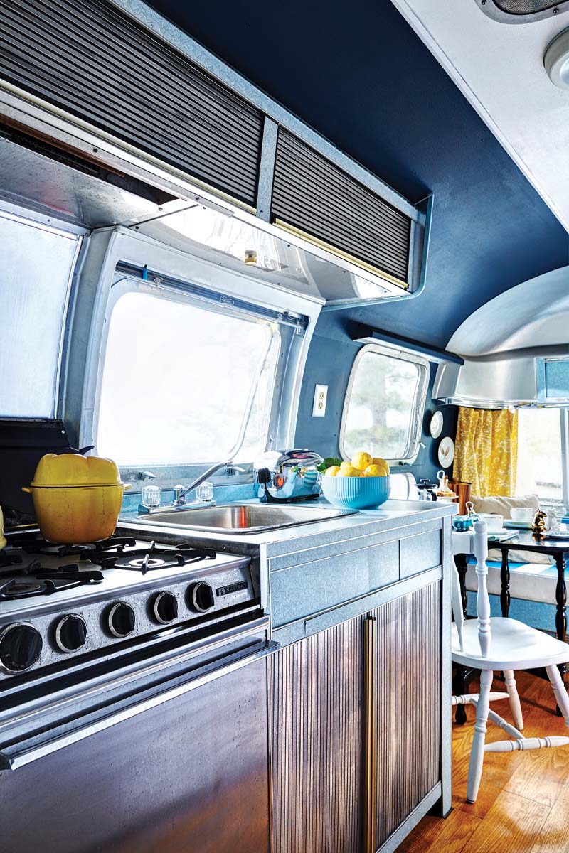 One of the first moves the couple made was to replace the Airstream’s kitchen counter with baby blue, metal-trimmed melamine ones repurposed from an old house that was being renovated nearby. They were going for an I Love Lucy look. “If Lucy and Ricky went on vacation, they would take this trailer,” says Stéphane. Despite its vintage vibes, the Airstream is well equipped for modern life: it’s hooked up to the property’s waterline, septic system, and power supply, plus its original heating and air conditioning still work perfectly, allowing guests to stay comfortably past Thanksgiving.