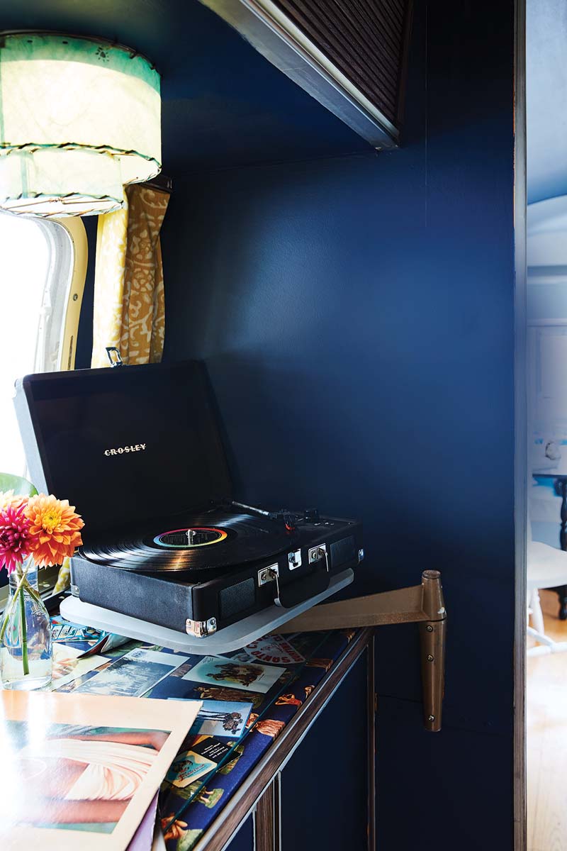 Though the trailer takes up fairly little space—just 189 sq. ft.—it sleeps four guests. When it’s time to sleep, the table folds down and the kitchen bench slides out to become a double bed. (Pillows and bedding are tucked away beneath the seat.) Stéphane replaced the original table with a versatile gateleg that fits flush against the wall, but can fold out to fit two leaves and accommodate five people. “We wanted something to break up the 1960s kitsch,” he says, “so we bought ’40s furniture, sanded it down, and lacquered it using a paint sprayer.”