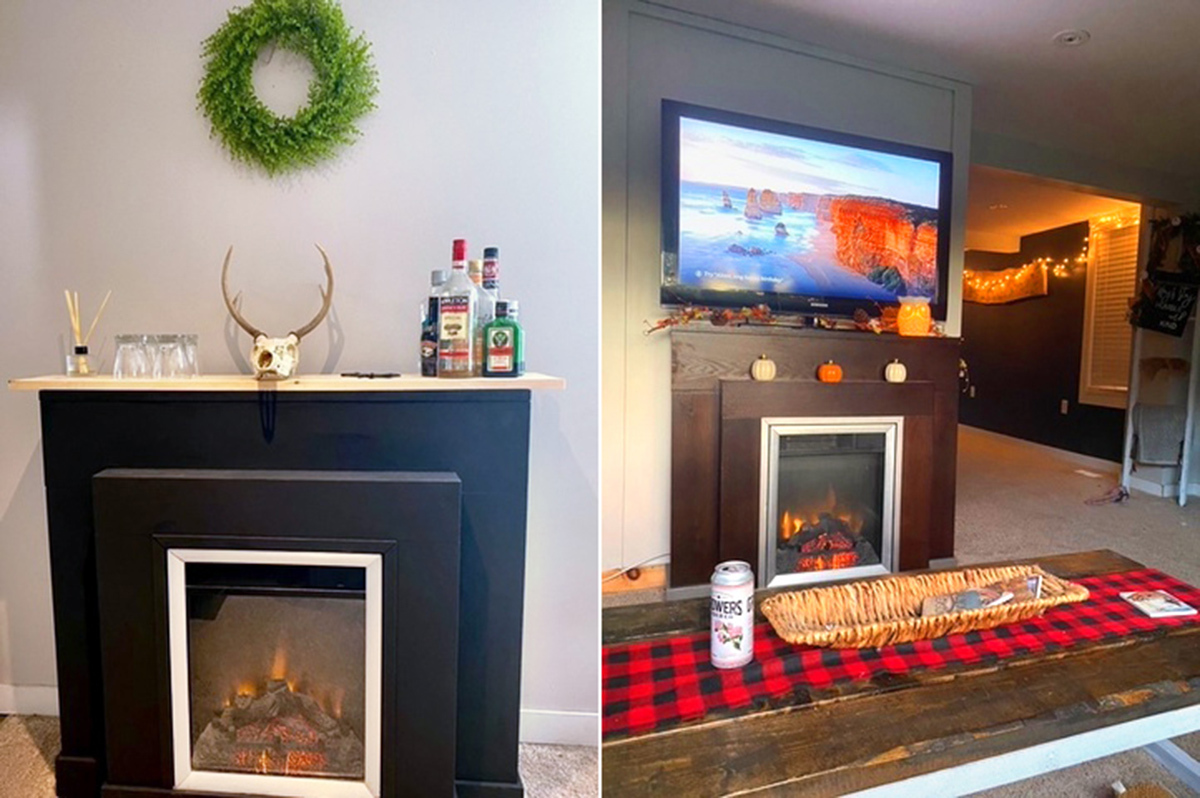 “The Euro mount on the fireplace is from a deer that Jason hunted himself,” says Brittany. They painted their fireplace to match the table and added an $8 pine ledge from Home Hardware to contrast the black chalk paint.
