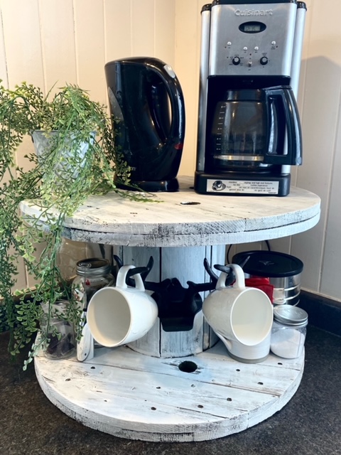 In the kitchen, the two set up a coffee station on an old wooden spool and painted it with white chalk paint to add a farmhouse accent to their home. “We were at a friend’s place for a bonfire and I noticed it sitting there,” said Brittany. “They were going to burn it for firewood, so I asked if I could take it.”