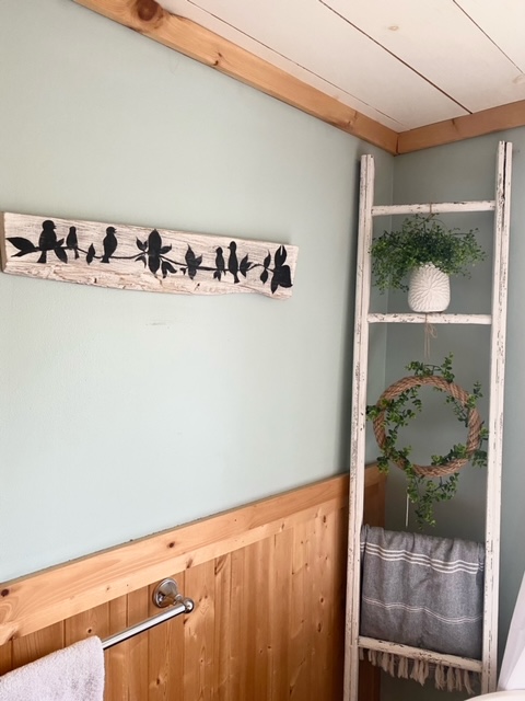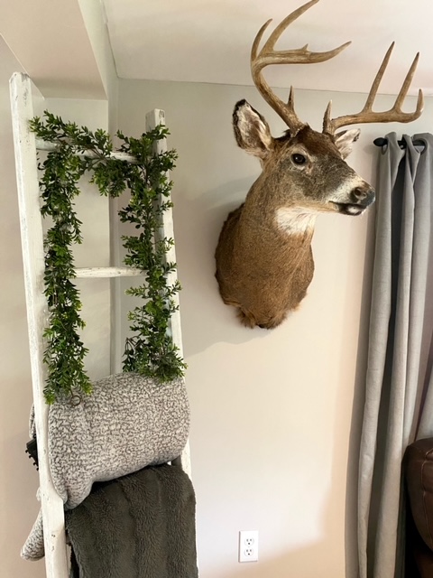 “Deer lose their antlers during shedding season every year so Jason went out and found those pieces in the woods,” she pointed out.“The toilet paper holder was all Jason—he can get full credit for that. I came home from work one day and it was just done.”