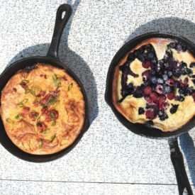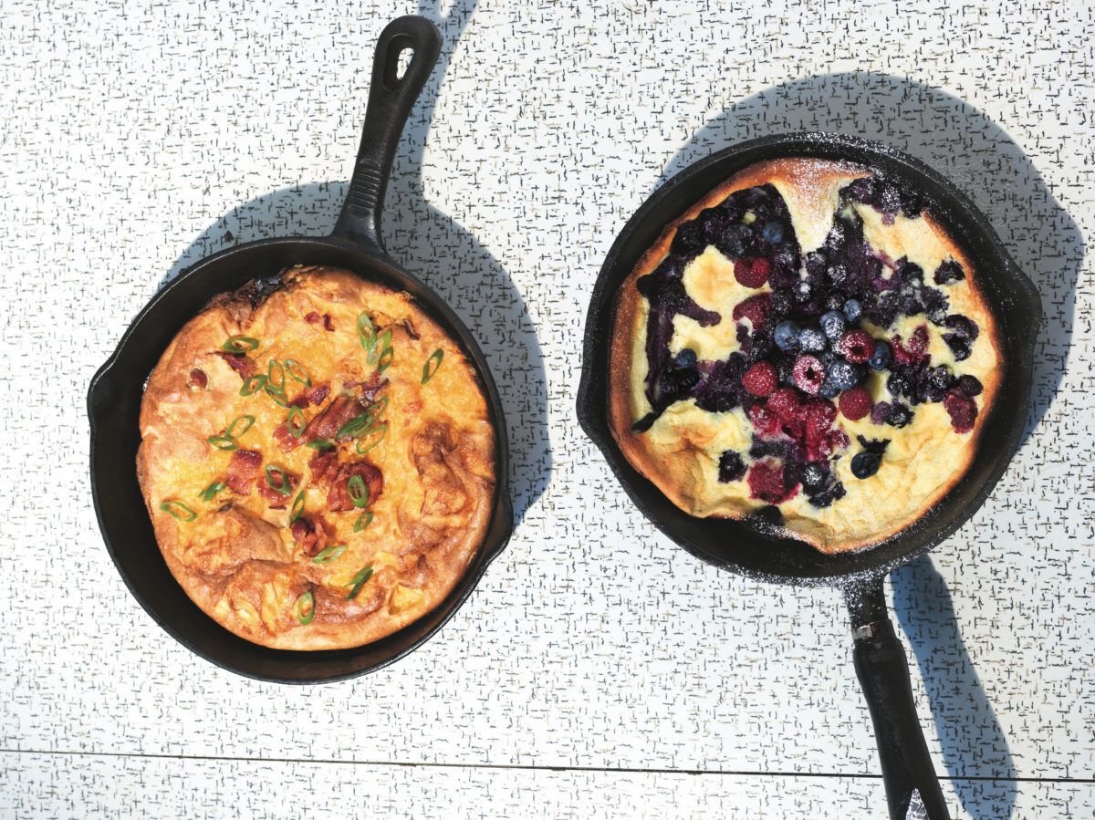Entertaining Dutch baby two ways: make it sweet or savoury By Evelyn Raab Published: November 27, 2017 Updated: October 30, 2025 share Share on Facebook Share on Twitter Share on Pinterest Copy Link Cancel Photography by Jim Norton Jump to Recipe Print Recipe Dutch Baby, two ways Evelyn Raab This is so crazy easy and delicious that you’ll want to have it every weekend. Make it sweet or savoury—or bake one of each. Everyone’s happy. No ratings yet Print Recipe Pin Recipe Course Breakfast Servings 2 people Ingredients 1x2x3xBasic batter½ cup all-purpose flour½ cup milk2 eggs½ tsp saltSweet dutch baby2 tbsp granulated sugar1 tsp vanilla extract1 tbsp butter1 cup fresh or frozen berries, or diced fruitSavoury dutch baby4 slices bacon fully cooked until crisp and roughly chopped (reserve 2 tbsp bacon fat)½ cup shredded sharp cheddar cheese Instructions Preheat oven to 425°F. Place 9 or 10″ heavy, oven-safe skillet (cast iron is great, but use what you have) or baking pan in the oven while it preheats.Blend together flour, milk, eggs, and salt (plus sugar and vanilla if you’re making the sweet version) until smooth.For the sweet version, remove skillet or baking pan from oven, and place it on a heatproof surface. Add butter to pan, and swirl around so butter coats the bottom and sides as it melts. Sprinkle berries or fruit evenly on the bottom of the pan, and then pour in batter. Place pan in oven.For the savoury version, remove skillet or pan from oven, and add reserved bacon fat, tilting pan to coat the bottom and sides. Add bacon, spreading it evenly over the bottom. Pour batter over bacon, and sprinkle with cheese. Place pan in oven.Bake for 15–20 minutes or until it’s puffed up and lightly browned. Take out of oven (it starts to deflate right away, so call everyone to see it at peak gorgeous), cut in wedges, and serve. NotesThis article was originally published in the Winter 2017 issue of Cottage Life magazine. Keyword breakfast Tried this recipe?Let us know how it was!