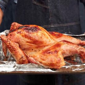 - Transfer brined turkey on the wire rack to the hot grill, legs and thighs positioned closer to the coals. Cover barbecue, situating top vent over cooler side of grill to allow for some smoky flavours to develop (use apple wood chips for extra-tasty flavour).