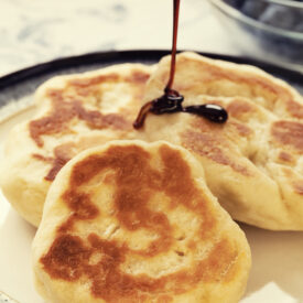 One of Sam’s all-time favourite Sunday recipes was introduced to us by his Cape Breton grandmother—his nan. Toutons, a fried bread with molasses, aren’t usually found on menus outside of Newfoundland unless you’re in North Sydney, N.S., where they see a lot of traffic from the Argentia and Port aux Basques ferries. The dough needs time to rise, so this recipe is ideal for early risers, which pretty much describes anyone with young kids (it doesn’t really work to prepare the dough the night before). Kids always like toutons—they’re a close cousin of doughnuts, so what’s not to like?