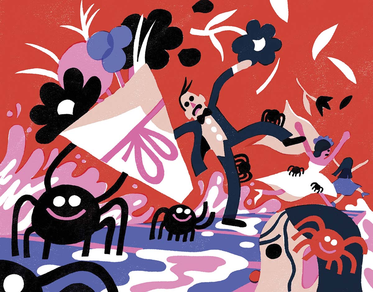 Hundreds of spiders—full-grown and babies—came up from between the boards. No one could hear my advice over the shouts of about 20 people too horrified or too surprised to do much but freeze. One of my sisters, with spiders crawling up her legs, rushed and dove into the boat, clipping her leg on the front pontoon. My twin nieces had high heels on—never a good idea at a cottage wedding—and unsteadily swatted at spiders climbing up their legs, squealing, and then booked it off the dock. All I could do was stand there and helplessly watch the chaos. Luckily, my wife, Janie, was taking care of other details and was not even aware this went on—she would have been mortified.