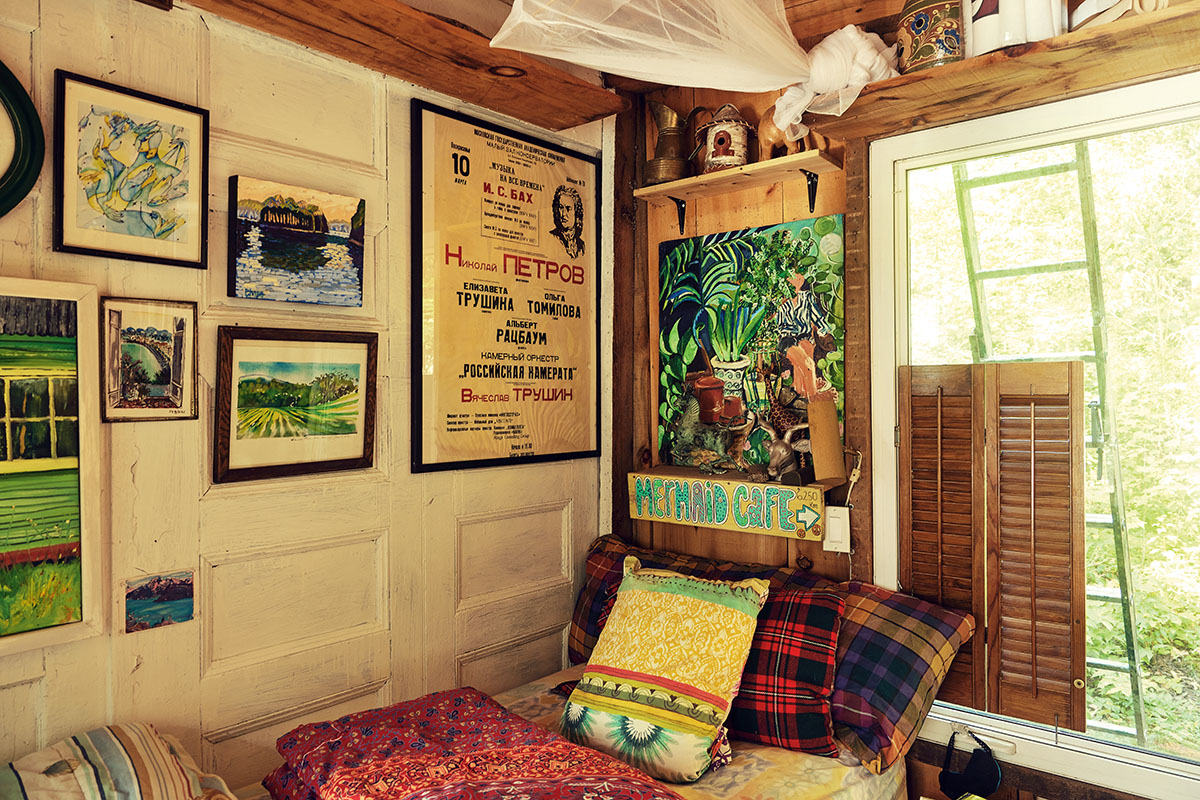 Paul lived in Russia for about five years, hence the collection of Russian memorabilia throughout the cottage, including this Soviet-style orchestra concert poster (far right). The wall is constructed from a large double door that was once a sliding partition in an old Annex mansion. The ceiling is made from pine boards from the mill in nearby Bancroft, Ont. Photo by Daniel Ehrenworth