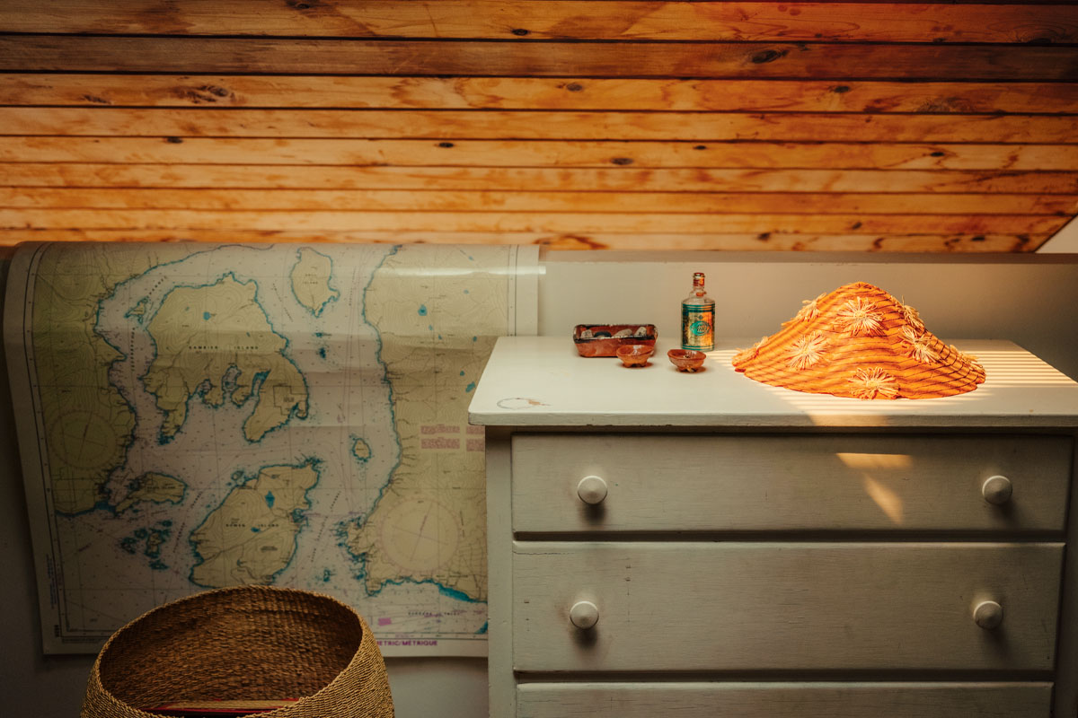 He remained friendly with the owners. A few years after the cabin was finished, he joined the couple for cocktails and met their youngest daughter, Elizabeth. The pair fell in love, married, and had two kids, Chessa and Max. In the summers, the young family would return to the island. They mostly stayed over in the old North side cottage, which they now call the Osburn cottage, where there were mismatched plates and mouse poop, cousins, and chaos. In comparison, the West side cabin had a single, uber-stylish—for the 1970s—sage green bathroom. The kitchen’s cabinets were filled with plates from Tonalá, Mexico. Outside, Pat and Julie docked the family boat, The Lamu, named for an island off the coast of Kenya that they loved.