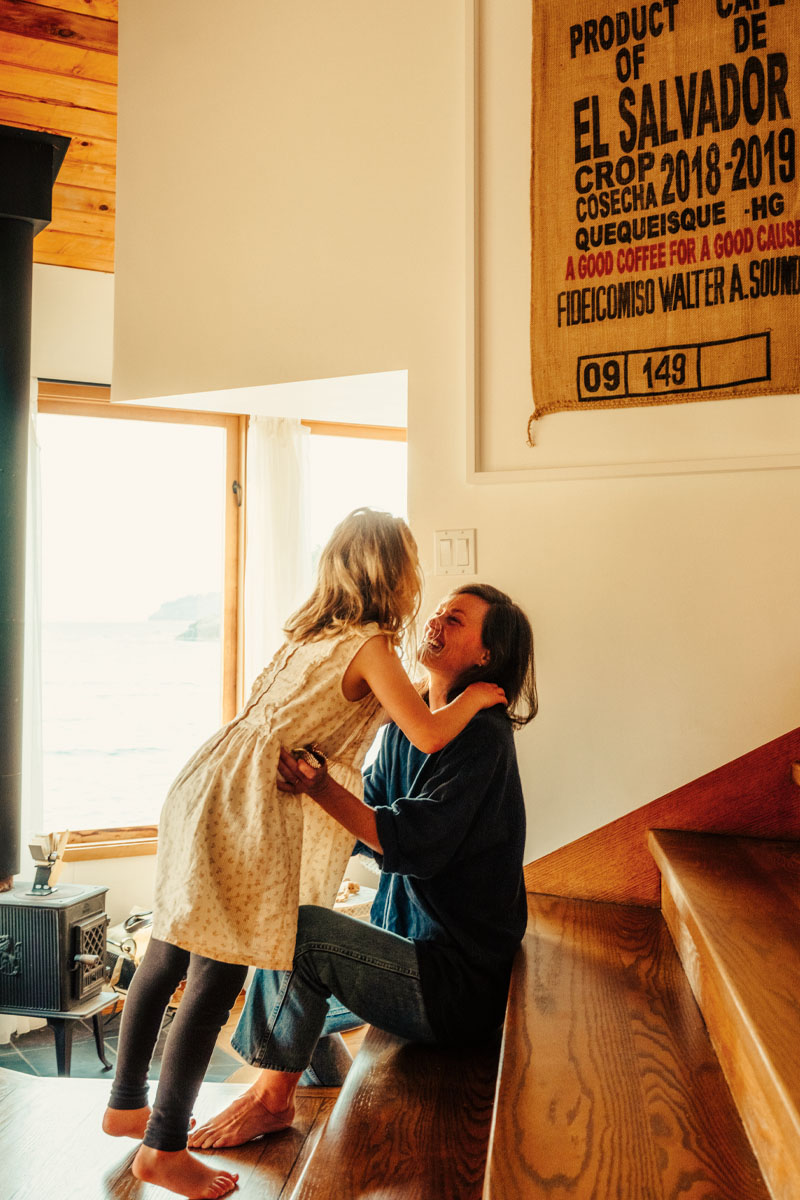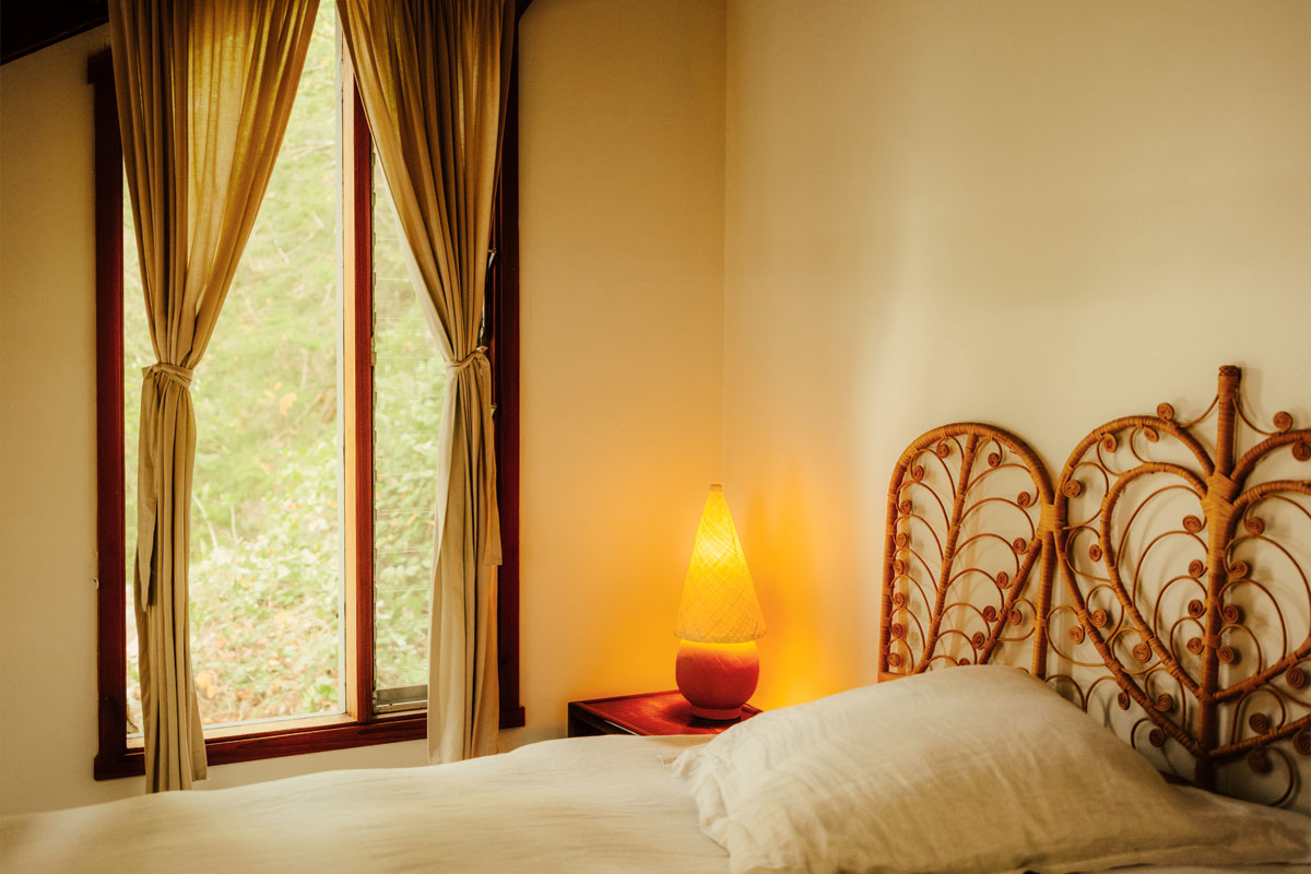 In time, Elizabeth and Mark divorced and Julie died, bequeathing the cabin to her children. The small upper porch began to leak, so it was filled in and turned into a very tall closet. There is still no access to the electrical grid, but the family installed solar panels over the back deck. Inspired by her grandmother, Chessa co-founded Twenty One Tonnes, a company that imports light fixtures, baskets, and textiles from artisans around the world. She’s added her own touches to the cabin: ceramic lamps with palm shades handmade by artisans in southern Mexico and a woven pendant light from a women’s organization in northern Ghana. It hangs above the dining room table. On the wall, her mother hung a framed coffee sack from her grandmother’s family’s coffee farm (now a charitable organization in El Salvador).
