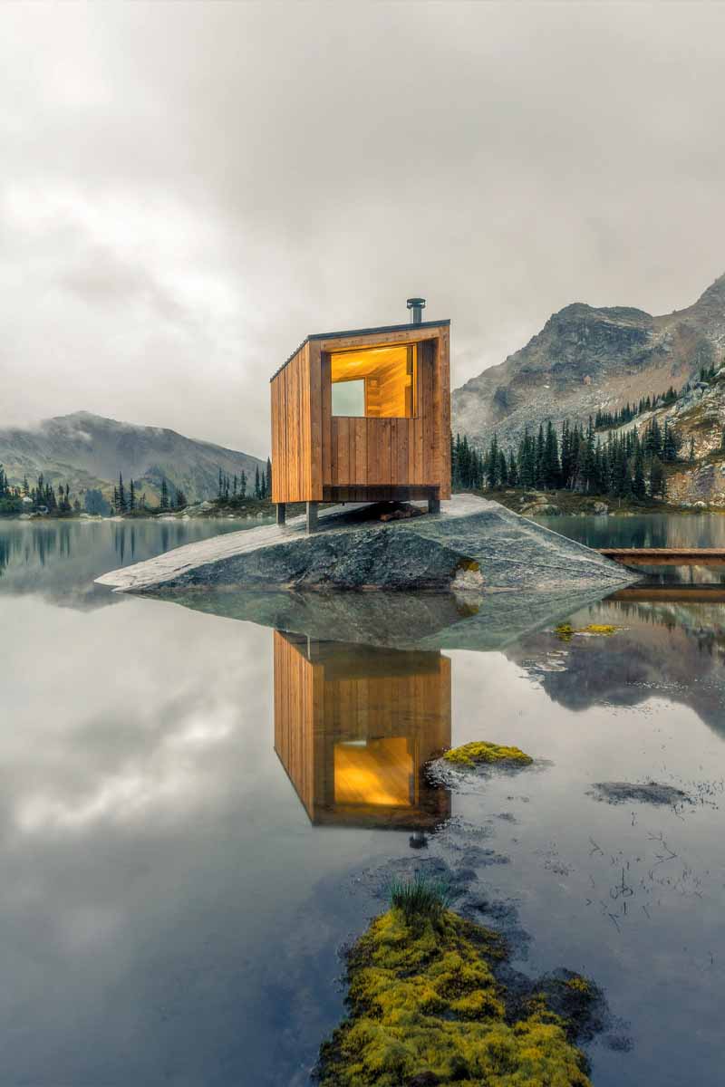 The sauna at McGillivray Pass Lodge sits atop a rock in a glacial lake north of Whistler, B.C. Many of the nearby hiking trails converge at the lake, so owner Lars Andrews and lodge manager Stefan Shier envisioned adding a sauna that would cap off the hikes. “One of my operations managers had spent some time at Nimmo Bay,” says Lars. It was that visit that inspired Lars and Stefan to get their plans in motion.