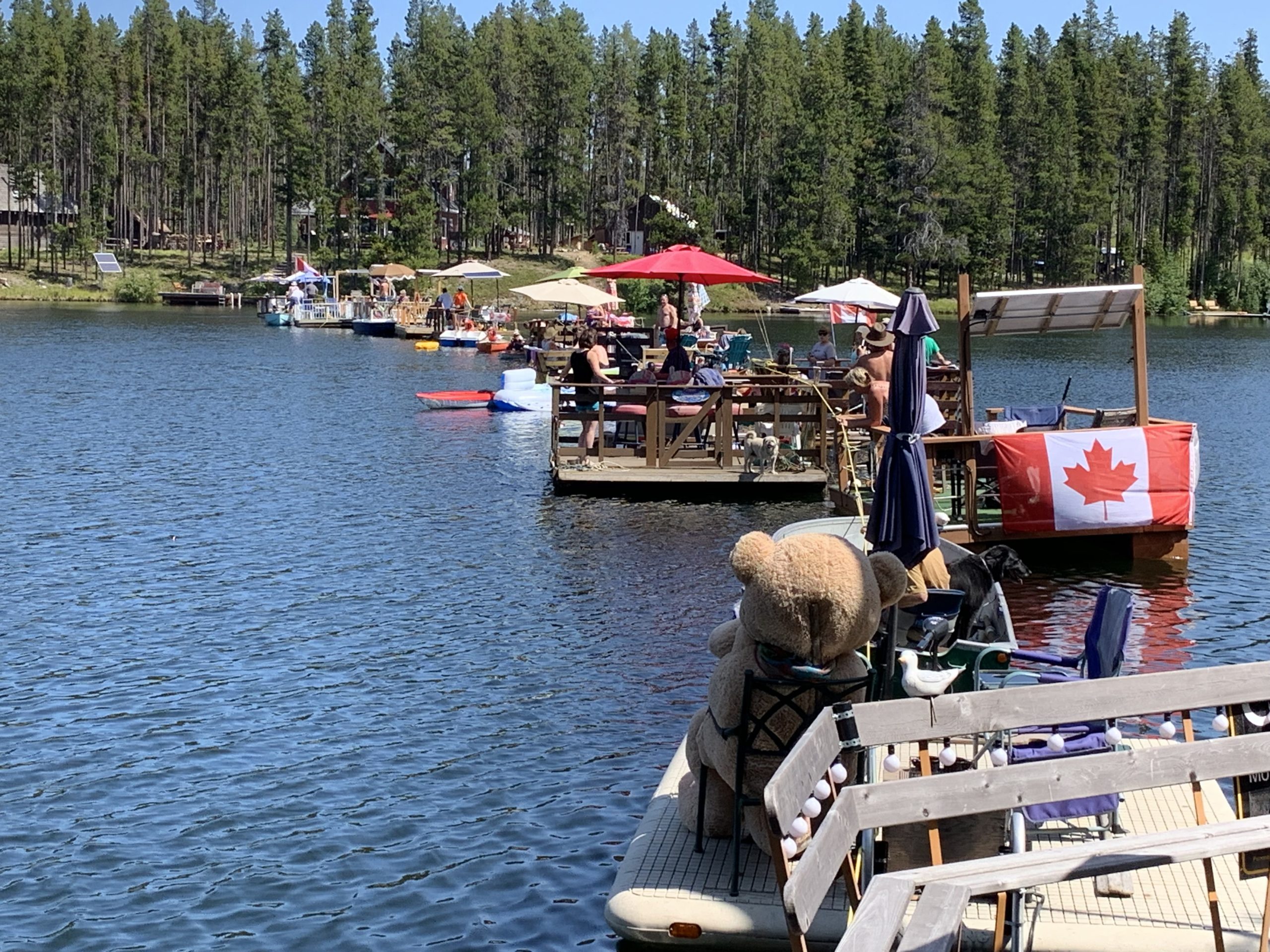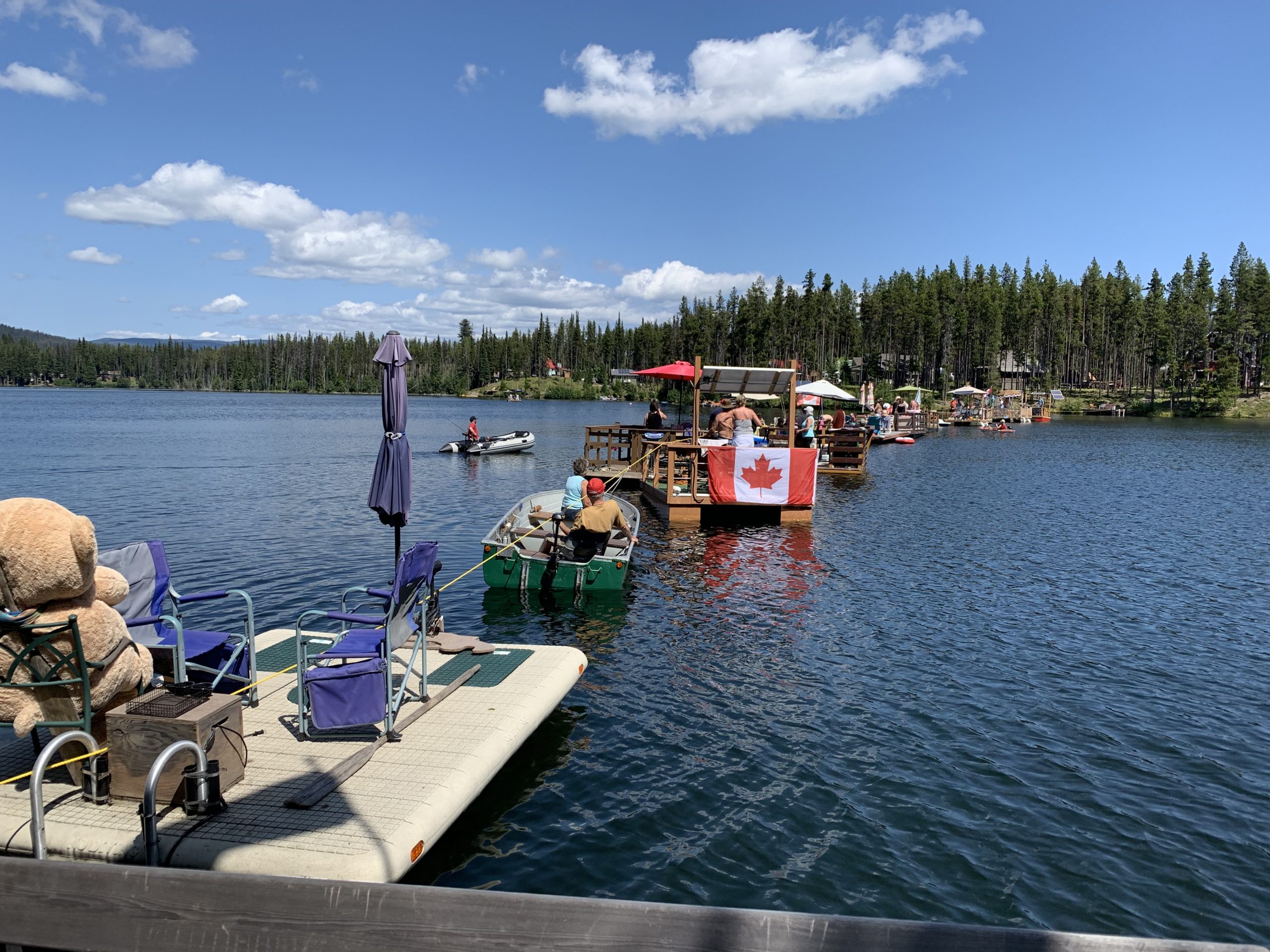 Along with her friend Gwen Chapman, Pat organized Bridge Over Headwaters on the August long weekend. The pair sent out emails to all 32 property owners on the lake. At noon on the Sunday, Bill unfurled a long length of yellow marine rope, stretched it across the lake, and had all the boats take up position alongside. “I counted at least 11 barges,” says Pat. “But people also came in their canoes, kayaks, and tinnies.”