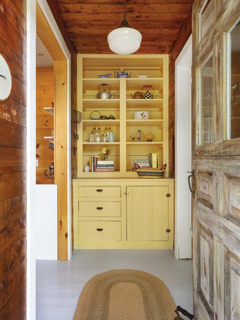 Designer Carolyn Pritchett made strategic paint choices in an effort to brighten the cottage’s red-toned wood: a “cheerful yellow” for the butler’s pantry; warm white on the window casings and painted-on lattice-work; and a misty blue for the floors.