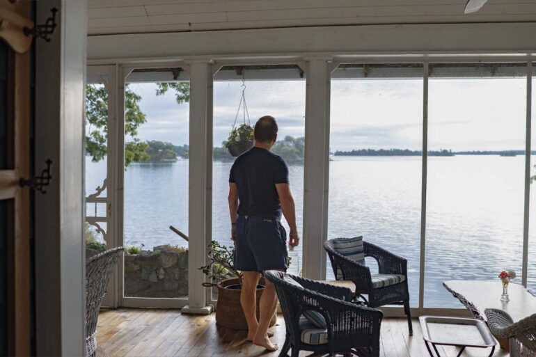 On the lawn of Chris and Gabrielle’s cottage—renamed Beach House for the property’s sliver of sandy beach, unusual in a place where most islands heave, steep and rocky, out from the river—a hammock swings in the breeze. Toward a marshy island cove, a family of swans swims by, cygnets in tow, and ink-coloured cormorants flap overhead.