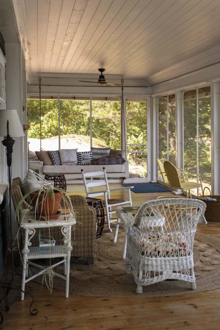 The screened porch features a swing that Gabrielle gave Chris for his 50th birthday. “I dreamed it up, and Peter built it,” she says. Though the couple considered changing the cottage’s exterior colour, they opted to keep the original green. Photo by Chris Katsarov Luna