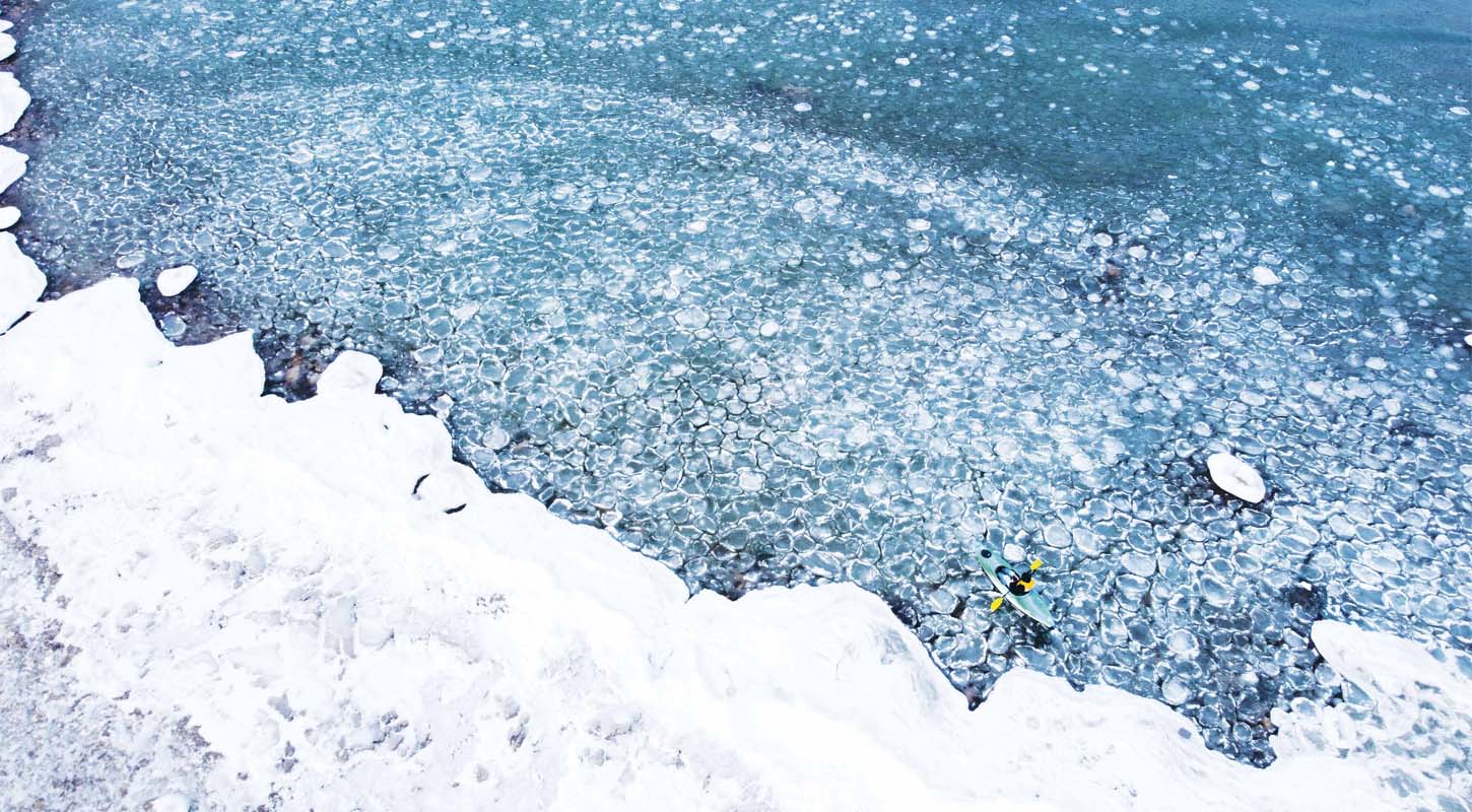 Hoan and his wife, Jenny, woke up at their cottage on a sunny winter morning to a surprise on the lake: pancake ice. The two ex-physicists were enthralled by the phenomenon and immediately went to take photos. Hoan owns a drone that he often uses to photograph their cottage, which is nicknamed “Casolena Lakehouse.” “A silly question popped into my head,” says Hoan, as he was preparing the shot. “Could we kayak through the ice?” With Jenny on shore piloting the drone and Hoan paddling, they took numerous photos but liked this one best. “I only made it 10 feet from shore, but it was the most magical morning ever.”