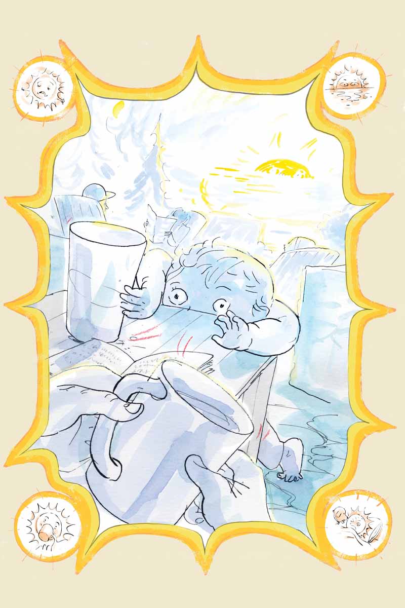 Meanwhile, back down at terrace level, Evie was still crawling. The degree of awareness from the world above her was something like the attention paid to the diaper-clad baby boy crawling on the floor of a crowded apartment in a scene I seem to remember from an old black-and-white Italian movie. Every few minutes the baby courts some disaster, reaching for a piece of broken glass or a frayed electric wire, before an adult arm swoops down at the last moment and plucks him from harm.