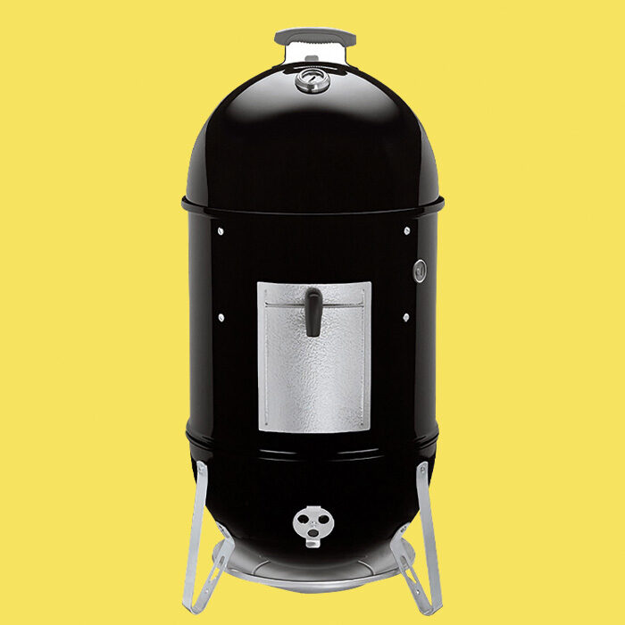Charcoal water smokers: a.k.a. “bullet” smokers. Time-tested performers, these smokers look like modular missile silos. Food sits on racks at the top of the smoker, suspended over a water pan. Beneath the water pan is a fire pan that makes the heat. Wood chunks placed on the hot coals make the smoke. The water pan keeps drippings from the meat up top from falling on the hot coals, helps to mitigate temperature swings, and adds humidity to the cooking chamber. Using air vents for temperature adjustment, a water smoker with a full load of charcoal or briquettes can maintain low barbecue temperatures for eight to 12 hours. To add additional fuel or wood chunks, better models have a sliding door to access the charcoal and water pans. Cheaper models make you take the smoker apart to get to the bottom section.