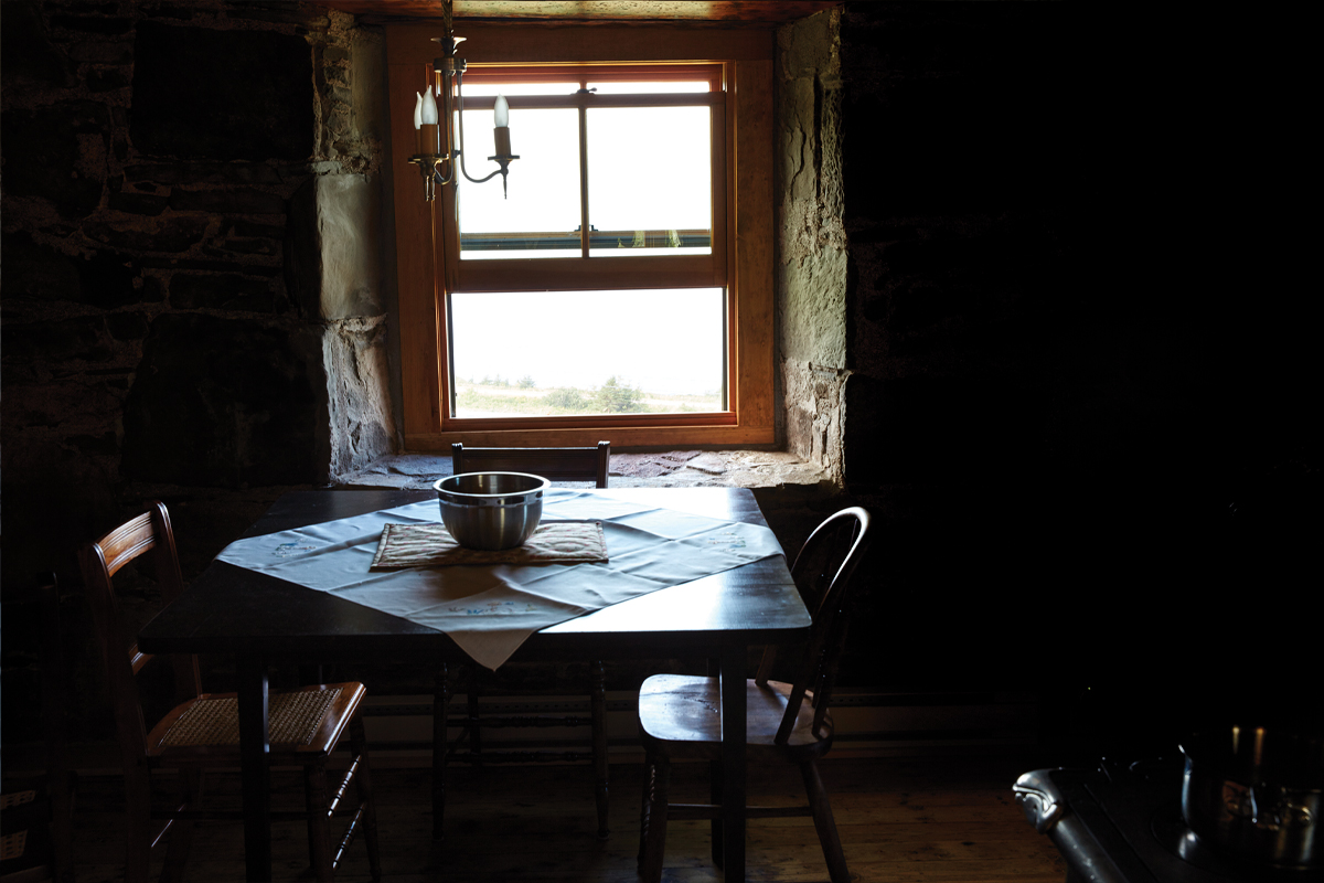 Iain arrived here from Moidart, Scotland, in 1801, a pre–Highland Clearances economic immigrant. That year, at least five ships—the Sarah, the Pigeon, the Aurora, the Dove, and the Golden Text—carried people from his home country across the North Atlantic to new homes in Nova Scotia. Compare this spot to photos of Moidart, and you can understand why Iain might have felt at home here: the landscape tumbling down towards the sea, the salt water dancing along the coast. Iain climbed the slope of his land grant—approximately 200 acres from the shoreline up and over the rise—and built his house on the hillside. The winds of Creignish must have laughed: legend has it that a driving rainstorm washed that first house down the hill. Legend also has it that Iain vowed that his next home would outlast the winds. And so he set to building a small stone house, with walls two feet thick, a kitchen and a parlour below, and lofts for sleeping above. Dropped on a hillside in Scotland, among the crofters’ cottages, it wouldn’t have looked out of place. Iain named it Moidart, for the place he’d left behind. Here, in this new country, above the waves of St. Georges Bay, he and his wife raised 12 children within the walls that now held the wind at bay.