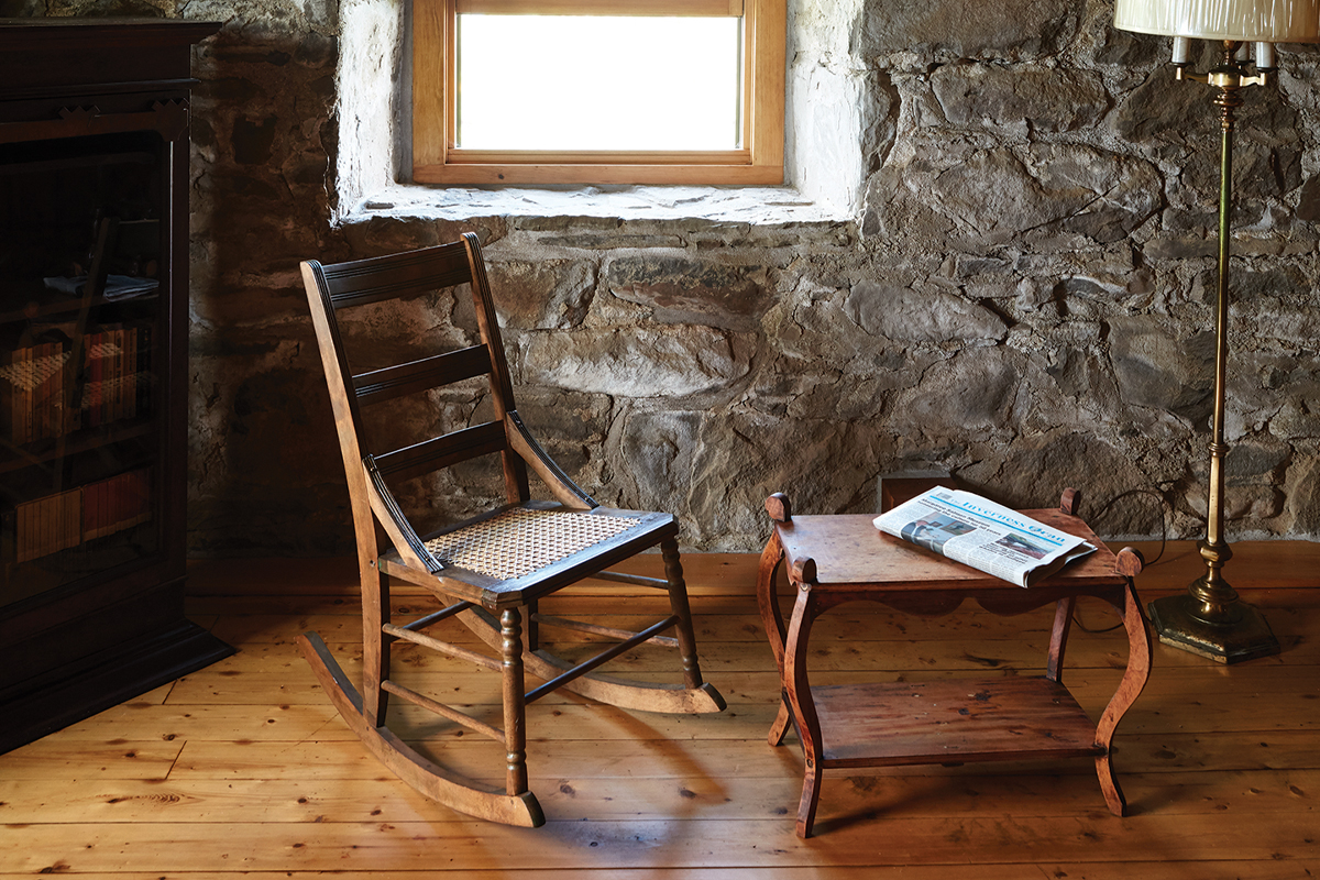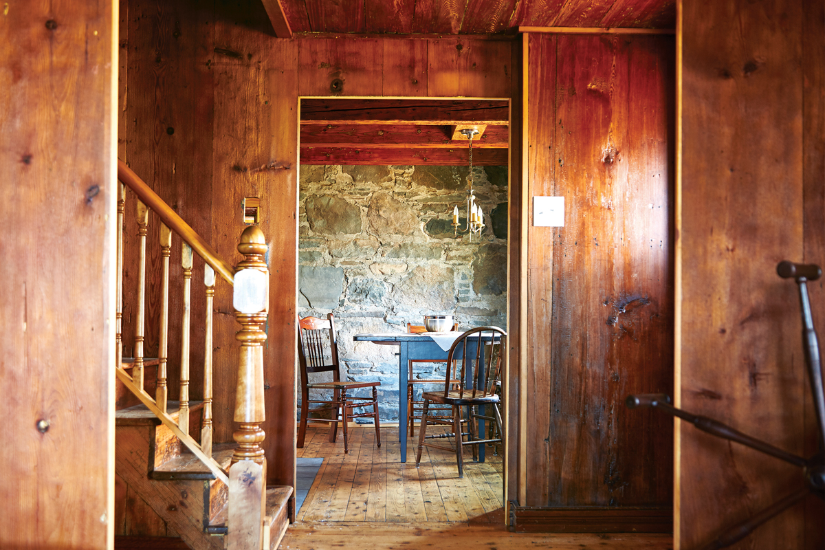 It took three months of deconstruction before Lorrie could decide where to start with restoration. She pitched in where she could, making 10 trips over 20 months from her home in Oakville, Ont. “I didn’t want to outsource everything and just arrive and look at things. I had to have some skin in the game,” she says. “I found a fishing gaff upstairs, put on a haz-mat suit, and pulled the insulation out of the cellar.” She hired Blaise Sampson, a contractor from nearby St. Peter’s, to remove the drywall, the carpet, and the linoleum, taking everything back to the stone walls and wooden beams. Lorrie’s cousin Aneas Gillis and friend Sandra MacPherson helped peel off flowered wallpaper backed with still-legible early-1900s newspapers. The parlour walls and the two-foot-deep window wells were faced with hemlock boards, probably original to the structure. Sampson fastidiously numbered each board so that it could go back in its original spot.