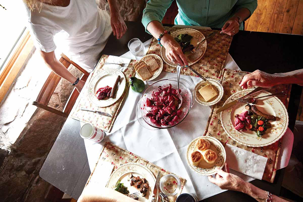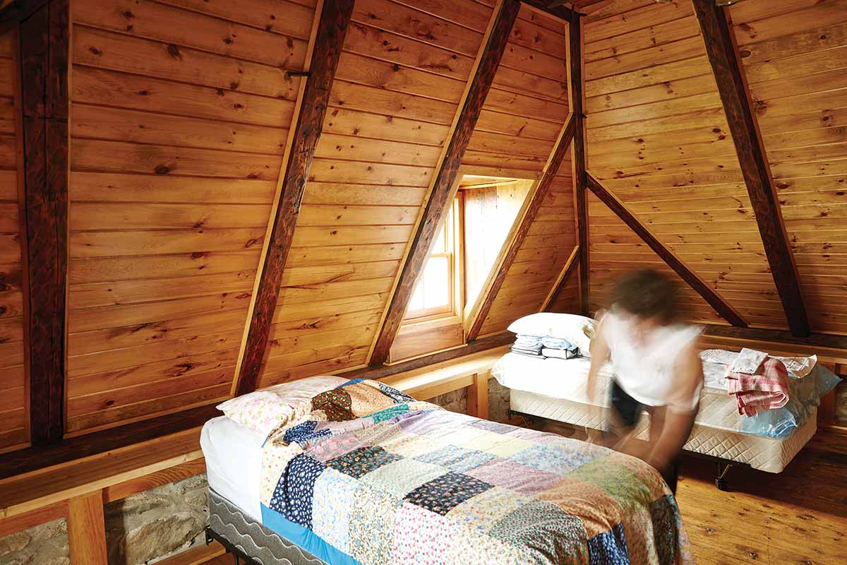 Inside, carpenter David Howe sanded and restored floors and stairs by hand, taking the wood back to its original finish. He recreated a trap door in the parlour to allow access to a second cellar found under the floor. (It was connected to the main cellar, under the kitchen, by a narrow tunnel that Lorrie discovered when she first cleared out the kitchen cellar. “I thought it must lead to another cellar, but was surprised by how much deeper, drier, and tidier the second cellar turned out to be,” she says.) In the bedrooms, Howe suggested enclosing the tops of the stone walls—where they meet a slanted roof, about two feet up from the floor—with hemlock boards rescued from the parlour so that each room’s exterior walls became edged in a wide ledge. The bonus? Wiring that would otherwise be a challenge to place along the stone walls could be hidden beneath the wood. Howe’s contributions didn’t end there: he framed and installed windows and doors, built the kitchen cupboards, did all of the exterior shingling, installed new support beams, replaced flooring, stripped generations of paint from exterior doors, built new screen doors, did all of the interior and exterior painting and varnishing, and more. “Everything he did was done with care, craftsmanship, and excellence,” says Lorrie. “It would have been a completely different outcome without him.”