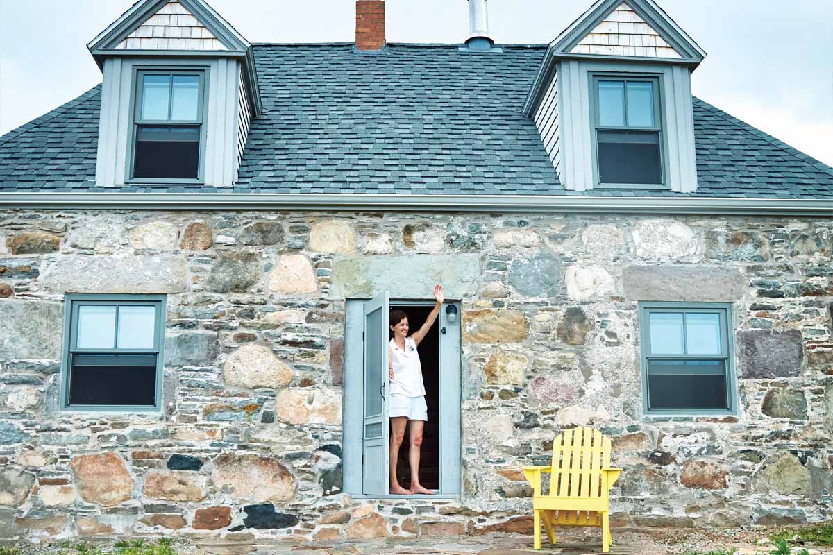 And, of course, there was the structural work. Local stonemasons Jerry Burke and Stefan Cernjak spent hours removing silicone and broken mortar, repairing cracks in the walls, and fixing the bulge in the back wall. One side and the front of the cottage had been whitewashed from the 1930s on, with the other walls left bare. The beautiful purple, brown, green, and grey of that bare stone—granite, sandstone, and whatever else its first builders found in the area—convinced Lorrie to have the other exterior walls cleaned back to their natural surfaces. The porch had been sided in aluminum and was structurally sound; inspired by a shingled lean-to in an early photo of the cottage, Lorrie decided to keep the porch but to replace the siding with wood shingles. The original roof had also been shingled in wood, “but the budget had to give somewhere,” says Lorrie, so she decided to use asphalt shingles instead.