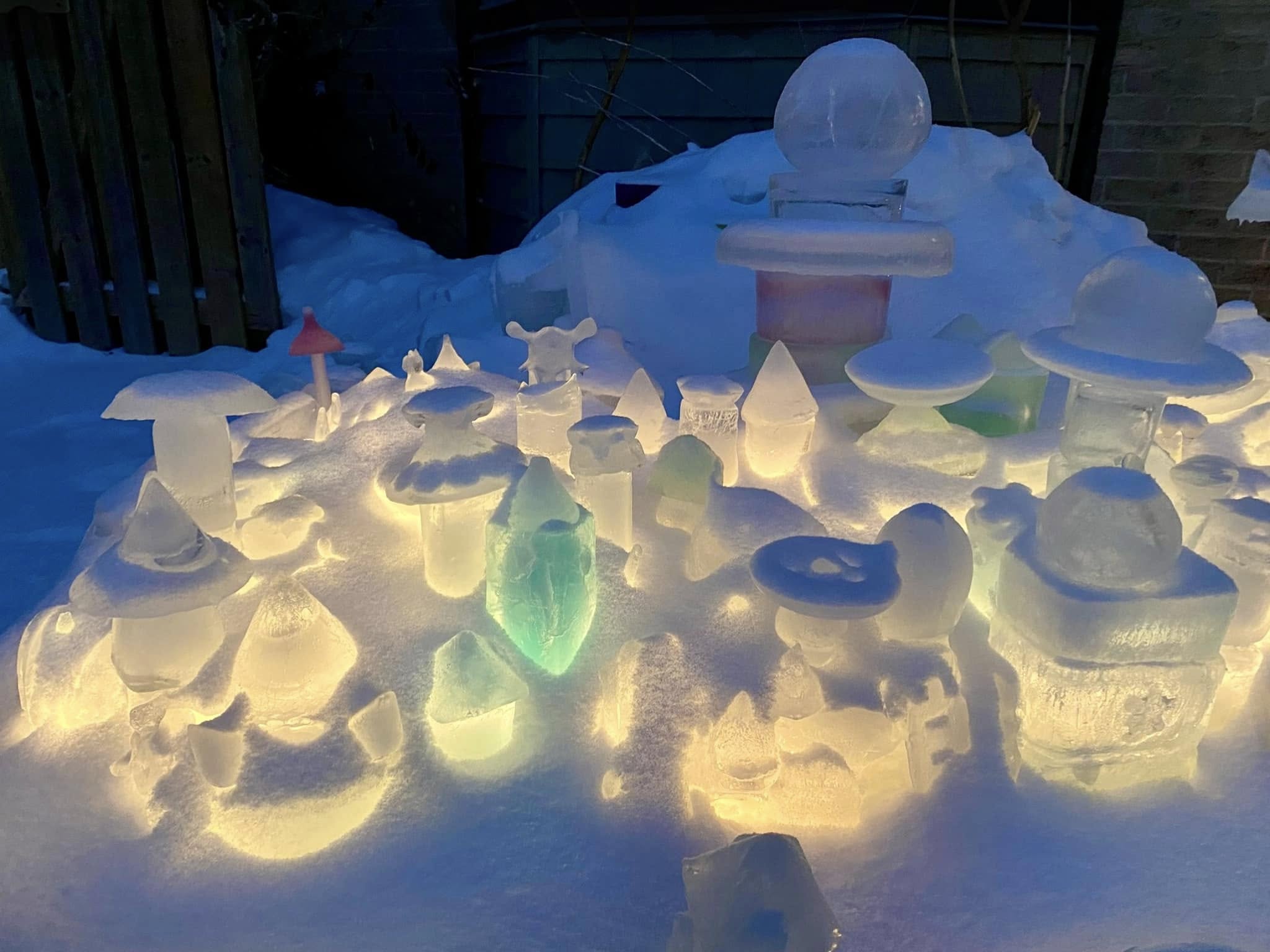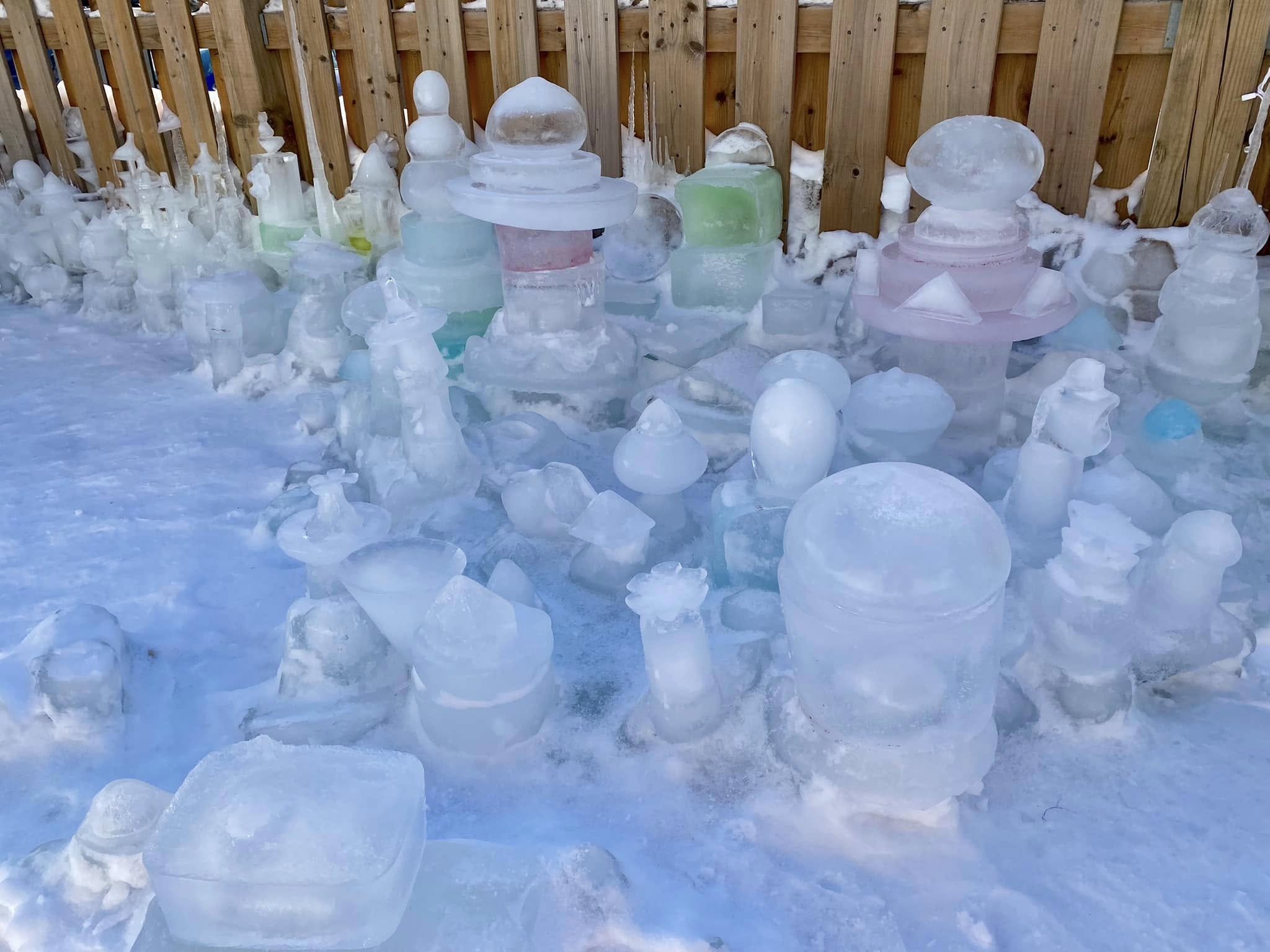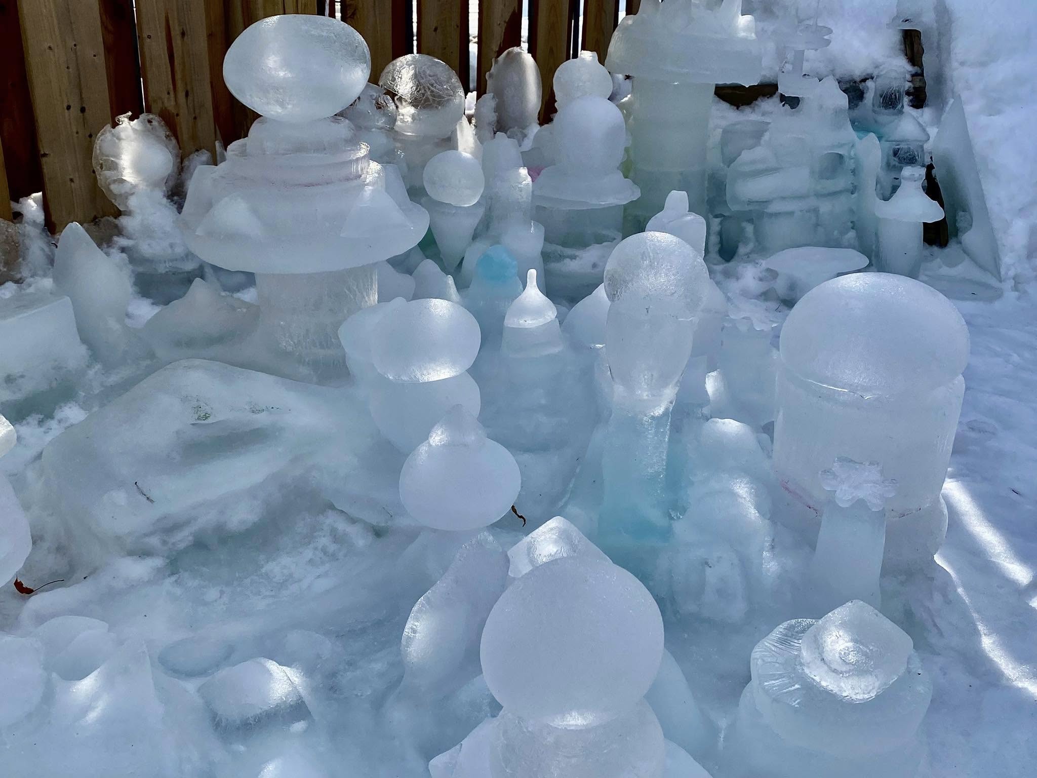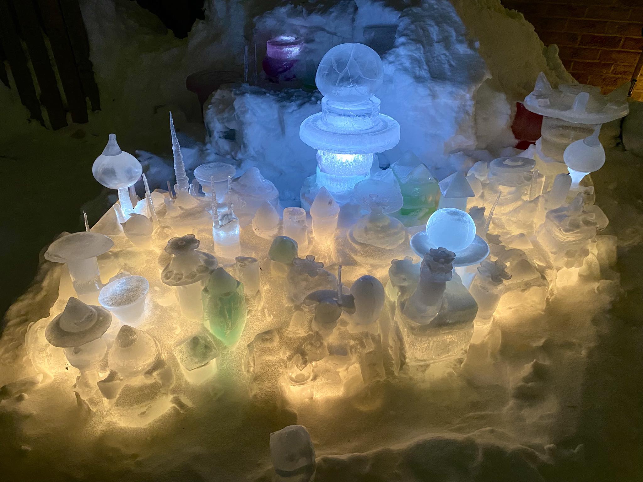 Robert has looped strands of Christmas lights underneath the sculptures, so that they glow in bright blues, whites, and greens at night. He says it’s the most magical time for Iceopolis and when the “city” truly comes to life. “I discover new things every year,” he says. “New pieces to make ice in, new techniques for freezing, and new light displays that I like.”