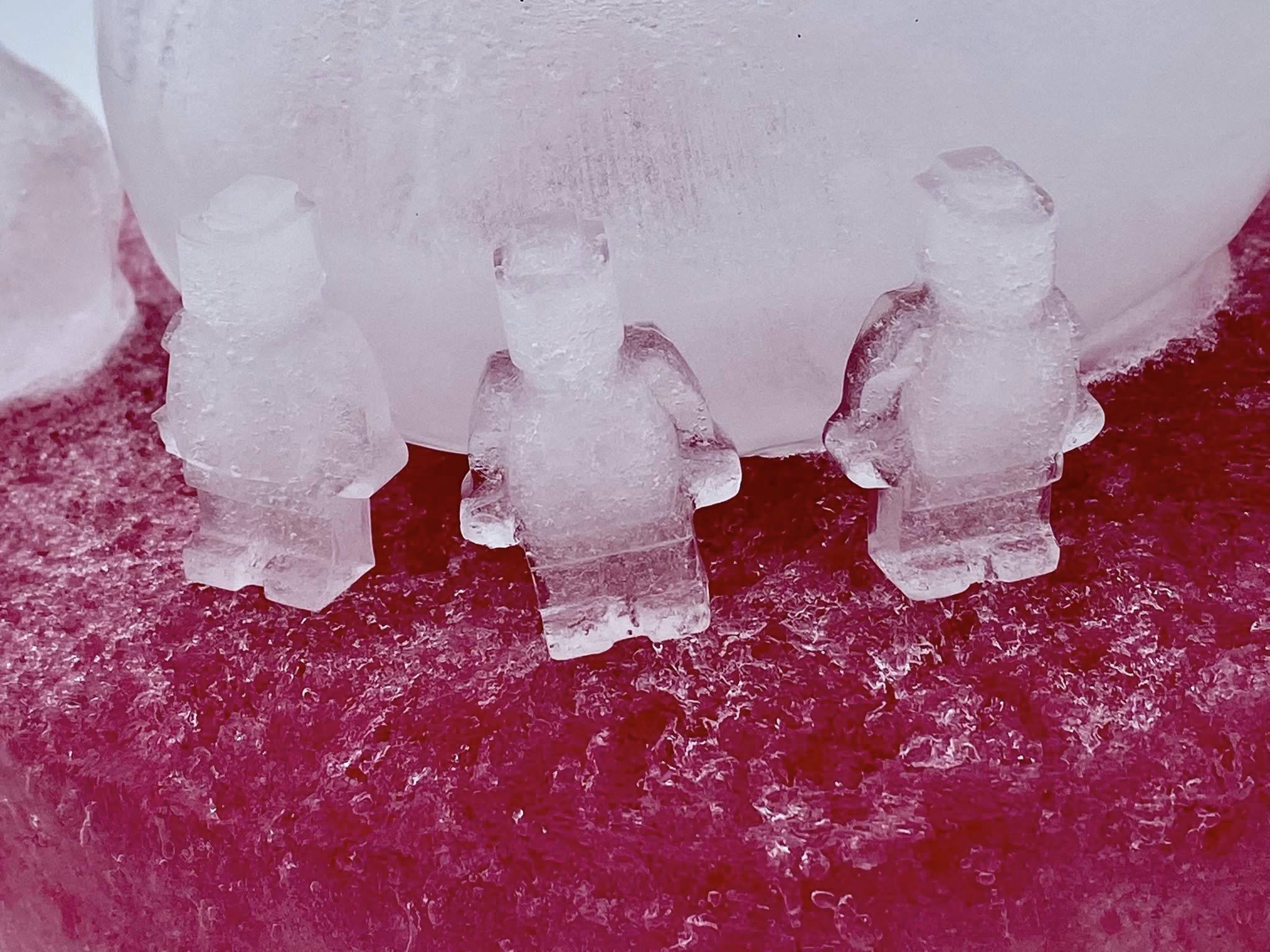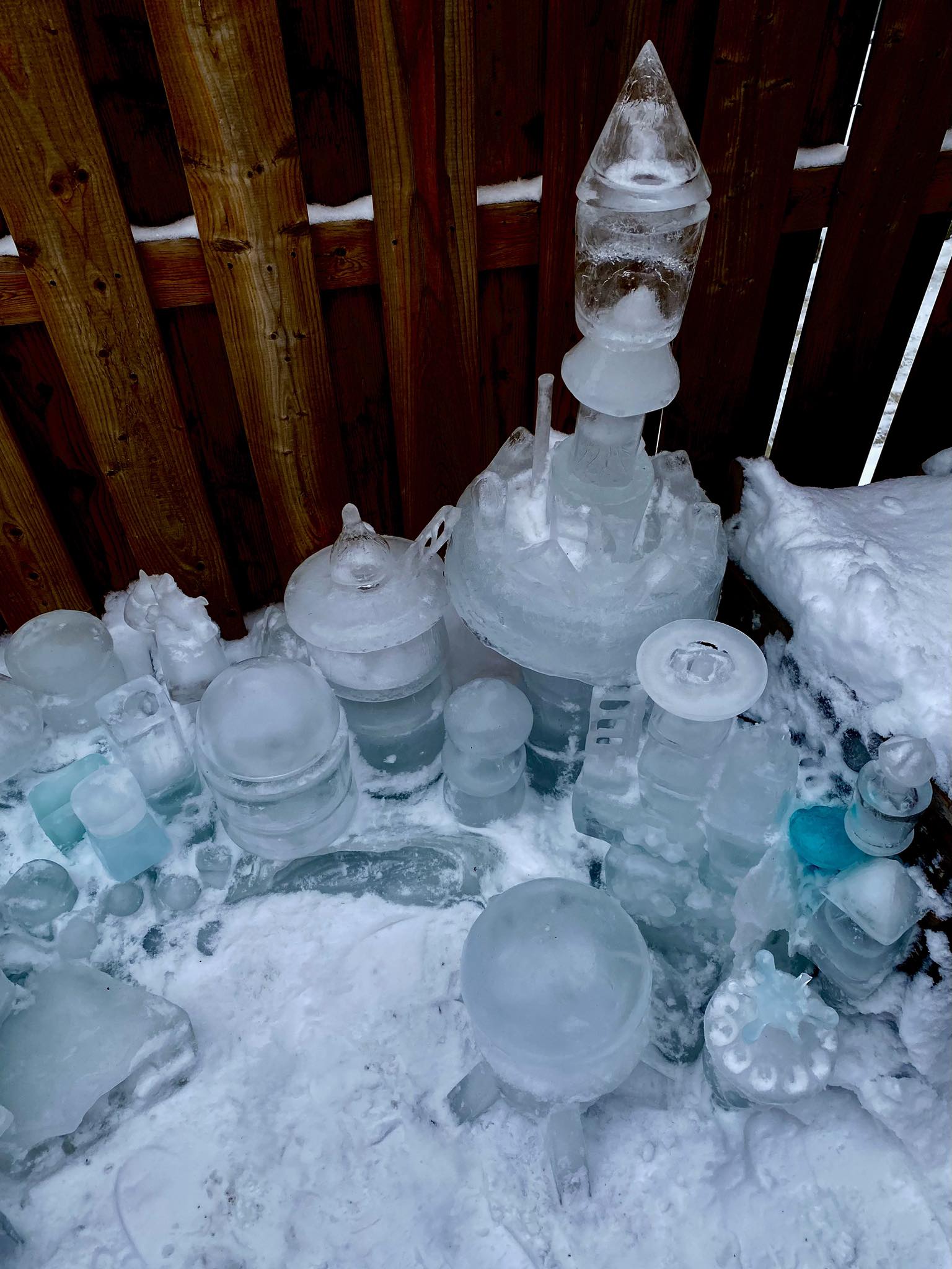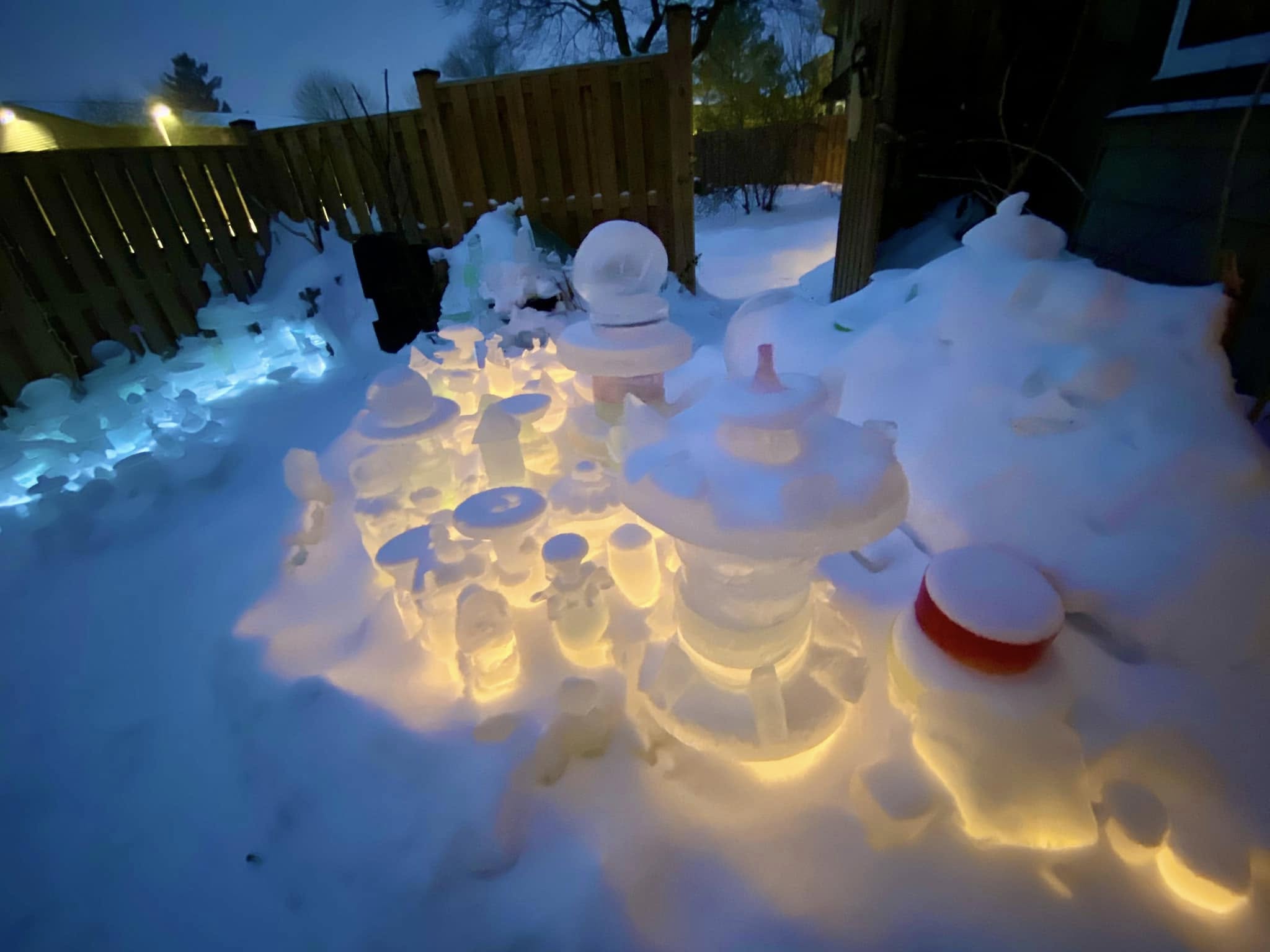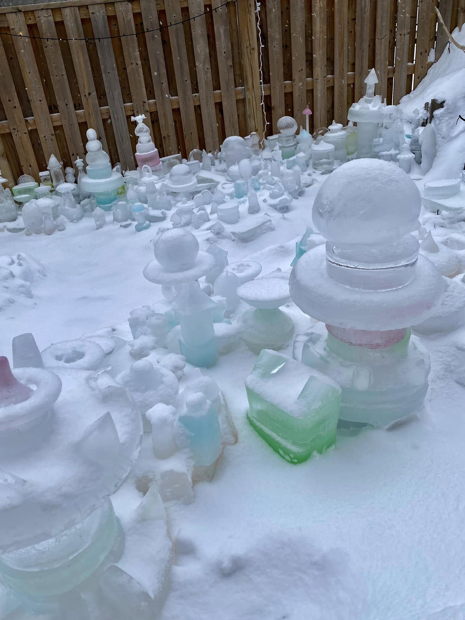 Robert has looped strands of Christmas lights underneath the sculptures, so that they glow in bright blues, whites, and greens at night. He says it’s the most magical time for Iceopolis and when the “city” truly comes to life. “I discover new things every year,” he says. “New pieces to make ice in, new techniques for freezing, and new light displays that I like.”