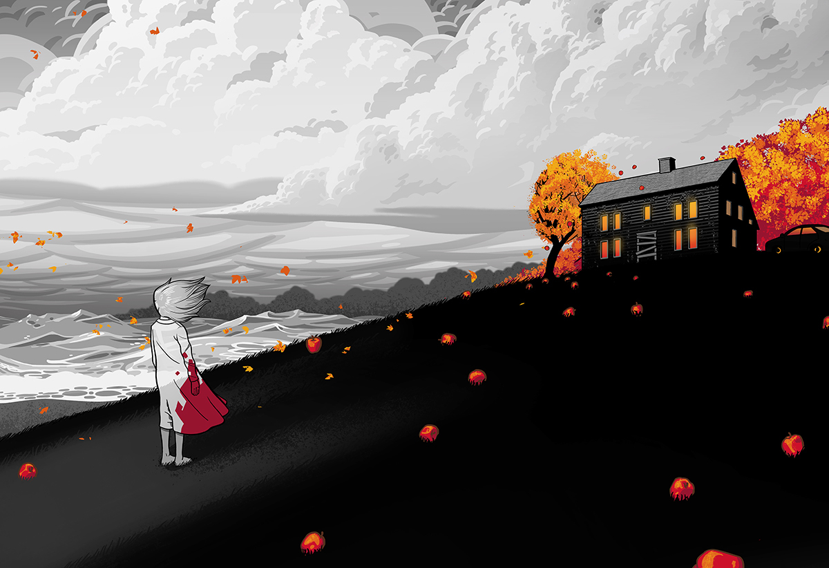 A bar of deep gold sunlight came through the small, round window of age-rippled glass that looked down on the roof of the car. There were shadows from the apple tree over the windshield, and I could only see a small patch of Fiona’s white velour sleeper, and the strap of the car seat. The rest of the car’s interior was obscured by the shadows, flicking orange and gold. The apple tree had grown a lot over the last year. The branches hung down to the ground weighted with hundreds of apples. I’d never seen so many apples. Stripey red and gold, many of them polka-dotting the long grass beneath the tree. The shadows on the car like a school of fish, chasing each other across the black expanse of the windshield, swimming as a single body, frantic, churning—though there was not a breath of wind.