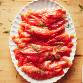General This honey mustard gravlax will be the star of your Hanukkah brunch By Amy Rosen Published: December 10, 2020 Updated: April 17, 2025 share Share on Facebook Share on Twitter Share on Pinterest Copy Link Cancel Jump to Recipe Print RecipeCanada’s cinnamon bun balabusta serves up Hanukkah brunch, cottage-style. Honey Mustard Gravlax The difference between lox and gravlax is that the first is smoked, the latter cured, giving it a more delicate taste and texture. It’s a headliner served with accoutrements such as cream cheese, red onion, tomatoes, cucumber, and capers. No ratings yet Print Recipe Pin Recipe Servings 8 people Ingredients 1x2x3x1¼ lbs coarse kosher salt2 lbs granulated sugar2½-3 lbs whole skin-on side of boneless fresh salmon (1.25-1.5 kg)½ cup liquid honey2 tbsp mustard powder1 bunch fresh dill washed and well-dried Instructions Mix salt and sugar together. Spread an even layer of about half of the mixture on the bottom of a large baking tray (big enough to hold the salmon).Place salmon on top, skin side down, and evenly pour honey on top of fish. Sprinkle with mustard powder.Completely cover with remaining salt and sugar mixture, carefully packing it down. No pink should show. Lay dill over salt and sugar (it will permeate), cover fish with plastic wrap, and put in back of fridge for 48 hours. (Reserve some salt and sugar mixture to seal broken spots, which can happen after about 12 hours.)After about 48 hours—I promise it’s worth it—the salmon is cured. Carefully wash off the salt and sugar with cool water, and pat fish dry withpaper towel.To serve, thinly slice salmon, on the bias, down to the skin (but don’t slice into the skin.) NotesThis recipe originally appeared as part of Amy Rosen’s story about Hanukkah at her family cottage, originally published in the Winter 2018 issue of Cottage Life. Tried this recipe?Let us know how it was! Related Story Try Amy Rosen’s family latke recipe for Hanukkah