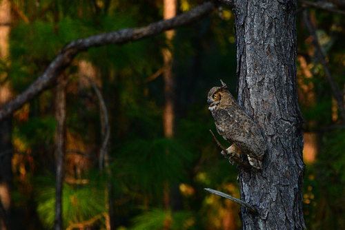 Great horned owls are widely distributed throughout North, Central, and South America, and have feathers that seem tailor-made for blending into tree bark. Although they look like ears, those “horns” you see are actually just feathery tufts. Owls’ ears, which are hidden in the feathers on the sides of their heads, are asymmetrical, meaning the birds can easily gauge the location of a sound in the dark.
