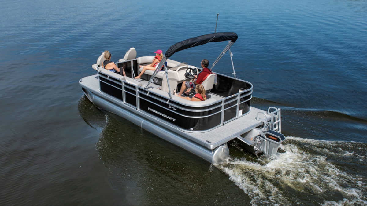 The sustainable electric Princecraft Brio 210-2S pontoon boat seats up to nine passengers. Photo credit: Princecraft
