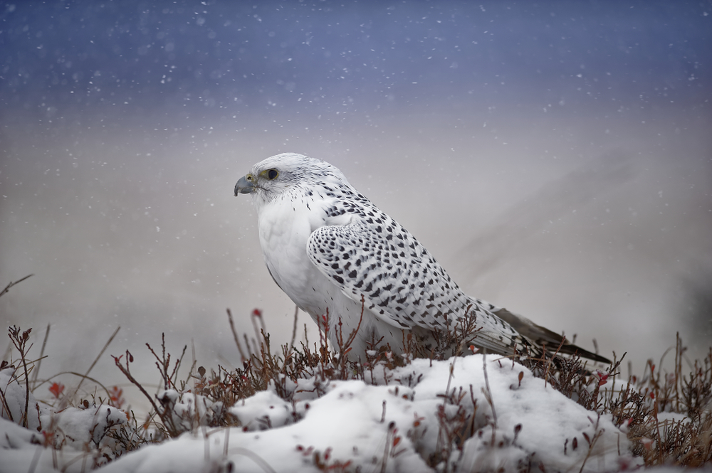 The gyrfalcon was named official bird of the Northwest Territories in 1990, and is the largest of the falcons. While they exist in a variety of shades from white to dark grey, gyrfalcons found in the Northwest Territories are commonly on the darker end of the spectrum.