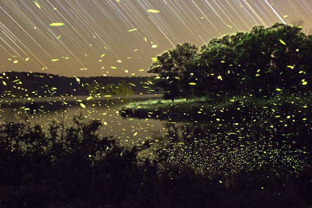 The larvae overwinter in the leaf litter in their pupal stage, then emerge in the spring a adult fireflies. Adults use their bioluminescence to attract mates. Each firefly species has it’s own light sequence – combinations of long and short flashes – which is how members of the same species recognize one another. Some species will purposely attract another species by mimicking its flash pattern. When a lovestruck member of the other species comes by, Anderson explains, “it’s dinner.”