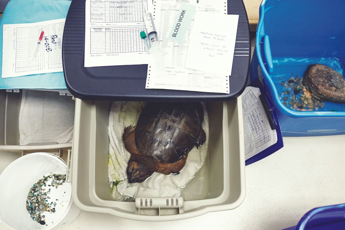 Carstairs is self-effacing about it, but she is probably among the world’s most experienced turtle veterinarians. A graduate of the University of Guelph, she knew from the start that she’d rather work with wild species than with pets. She regularly borrows techniques from other medical disciplines, and gear as necessary from non-medical ones, to get the job done. She keeps her surgical supplies in a four-foot-tall, black-and-silver steel tool case donated by Home Depot. To bore holes in turtle shell pieces, she uses a dental drill, then loops orthopaedic stainless steel wire through them to hold the pieces in place. She sometimes wires other body parts back together too, but Porter’s jaws were fractured in so many places that wire wasn’t feasible, so Carstairs taped them back together and changed his dressings regularly.