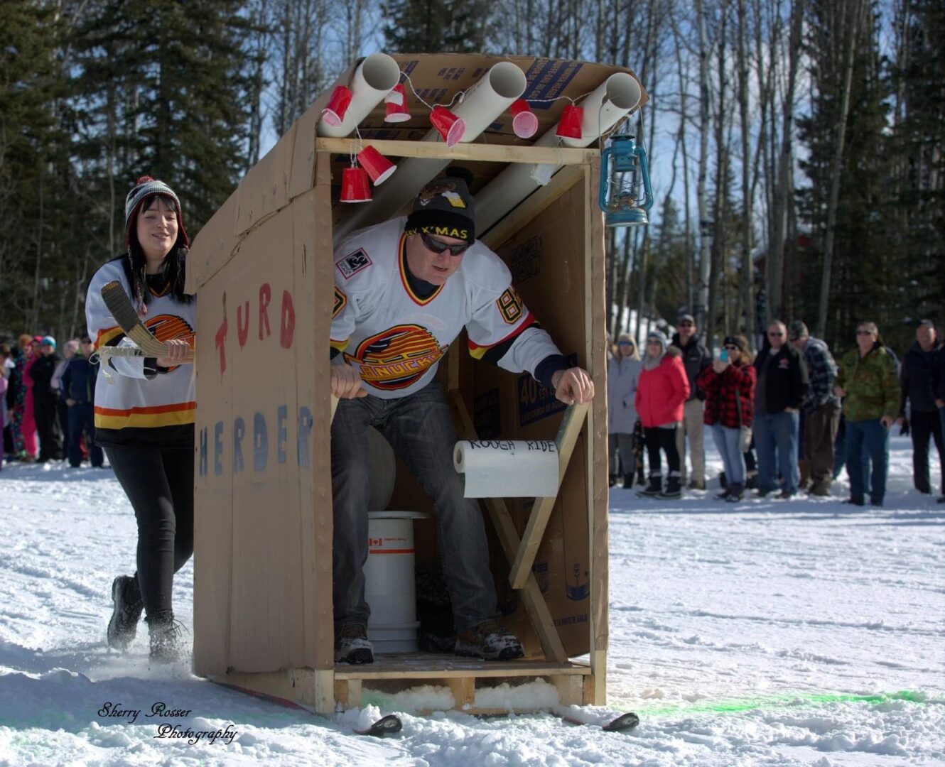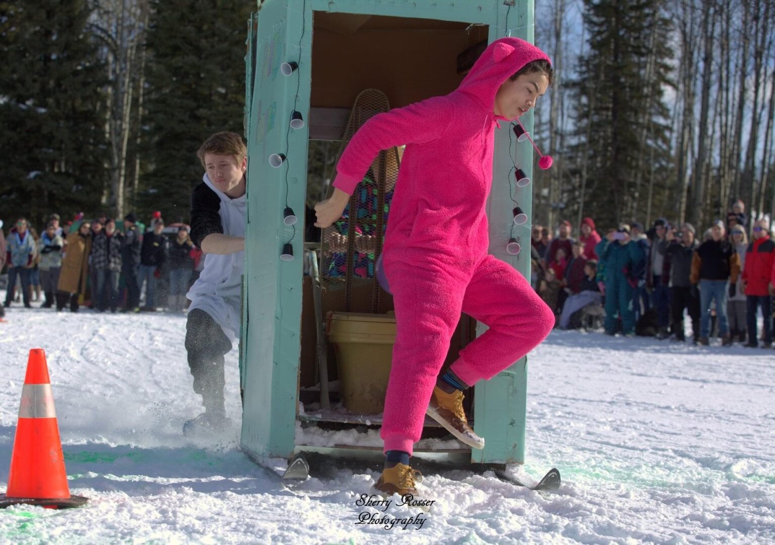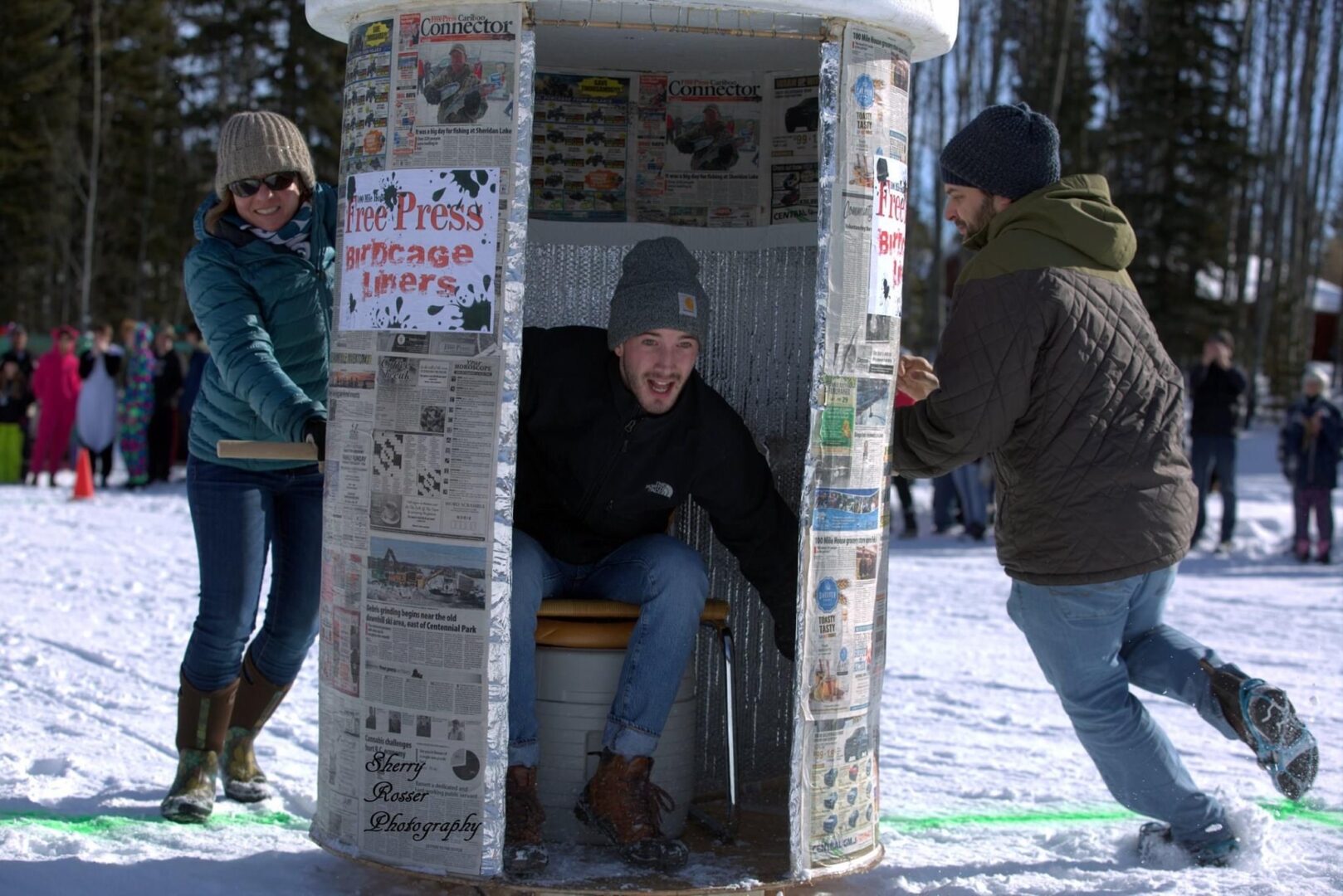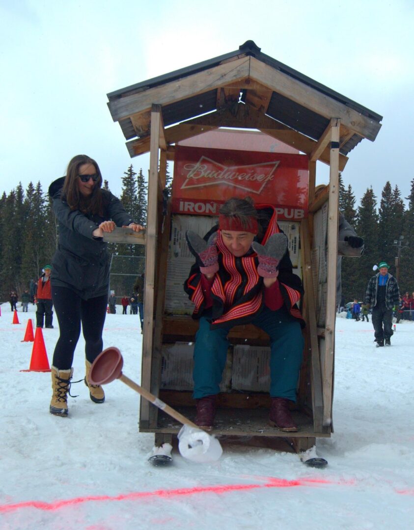 Competitors race in the men’s, women’s, or junior’s divisions in teams of three. Two teams race against each other at a time, with the object being to complete the course the fastest. The twist? Teams are pushing, or pulling, an outhouse on skis, while one of their teammates sits inside of it.