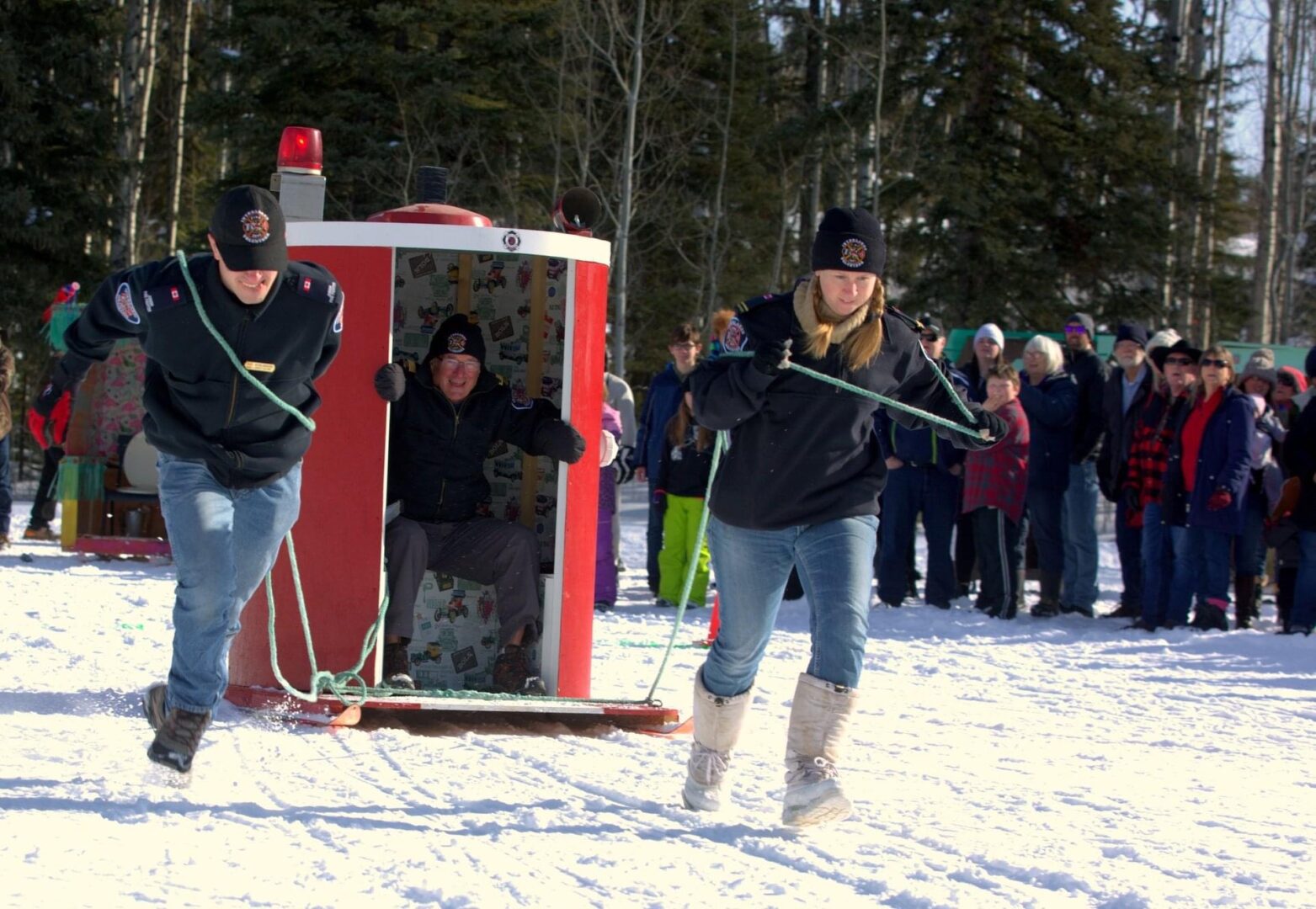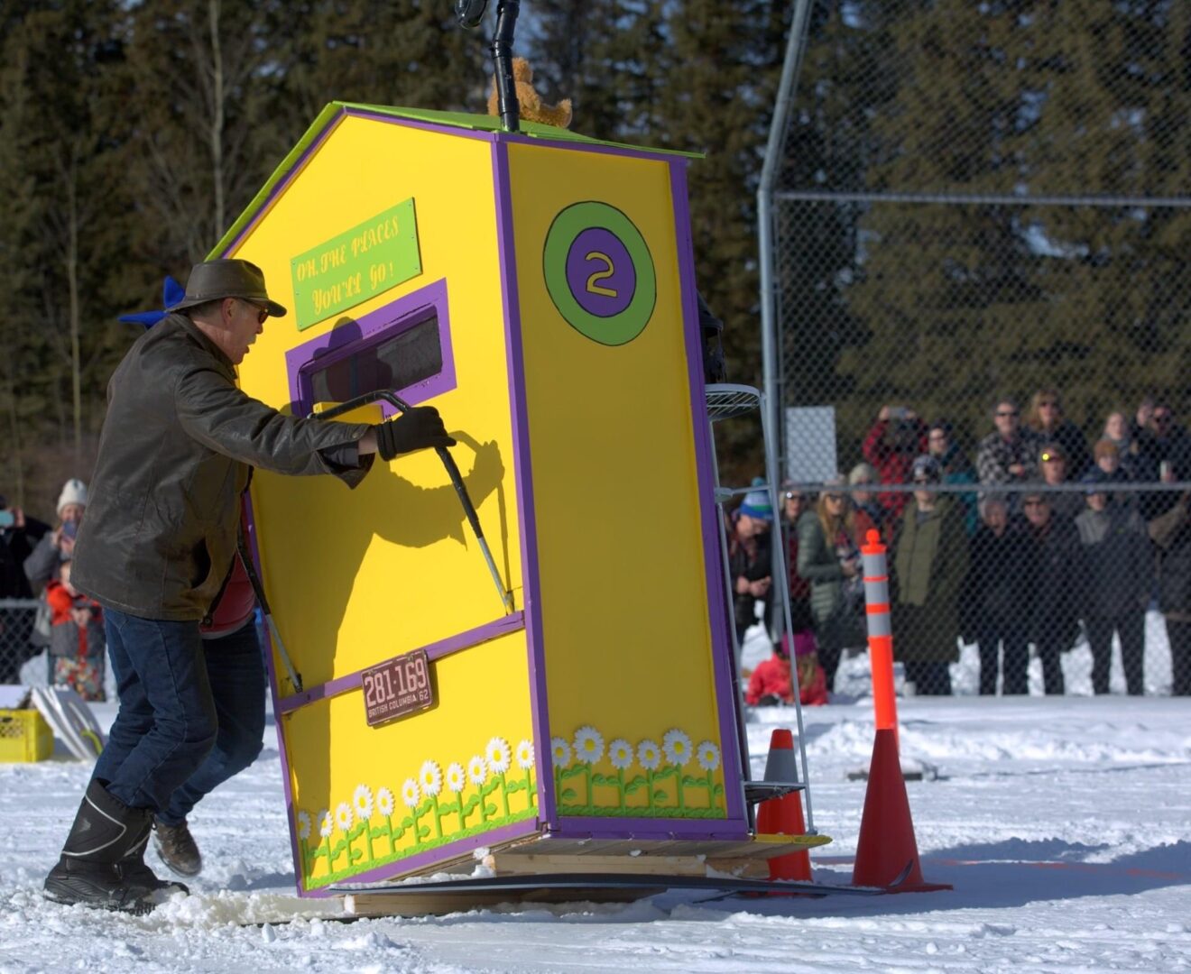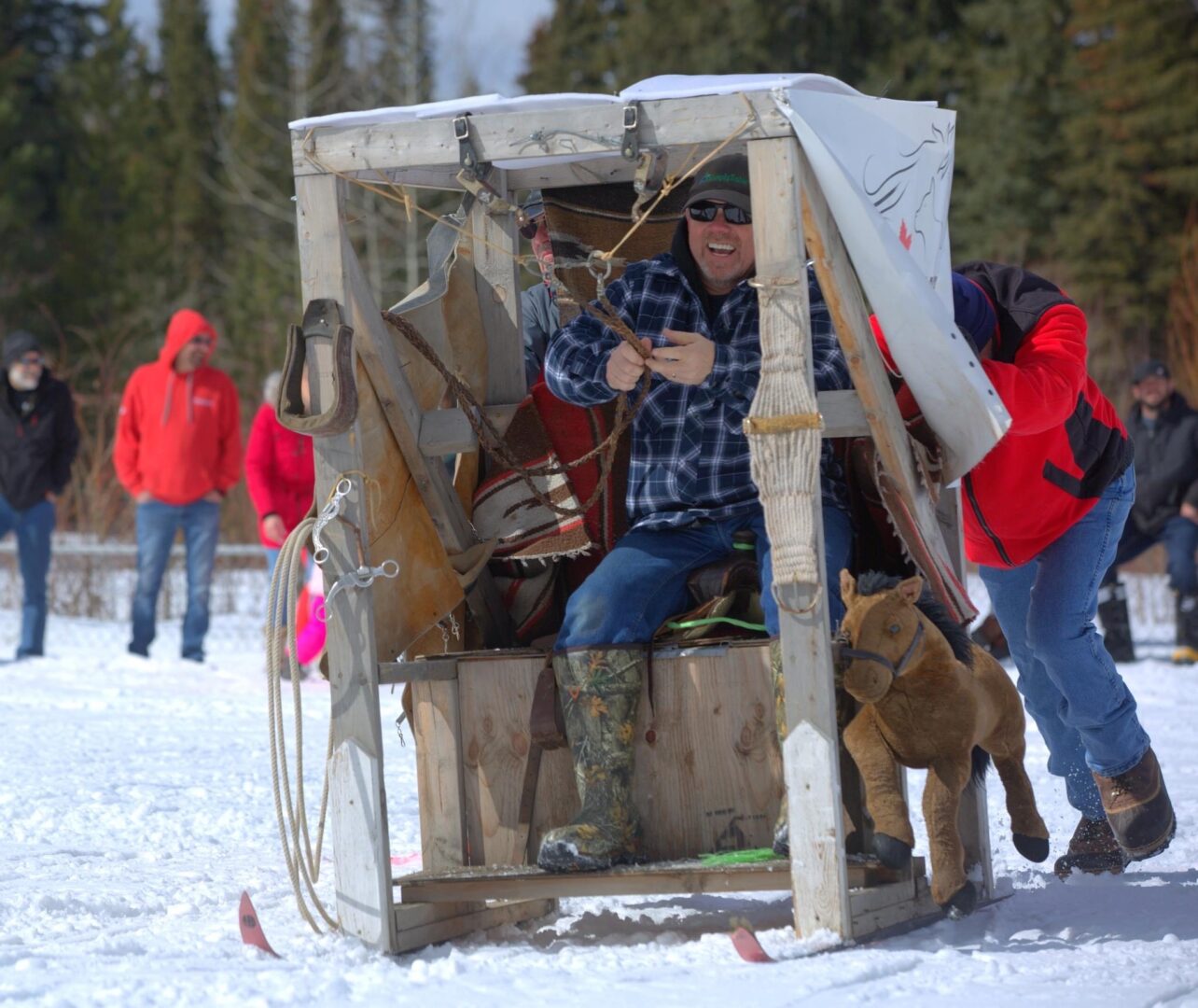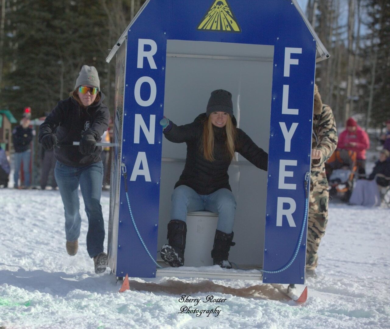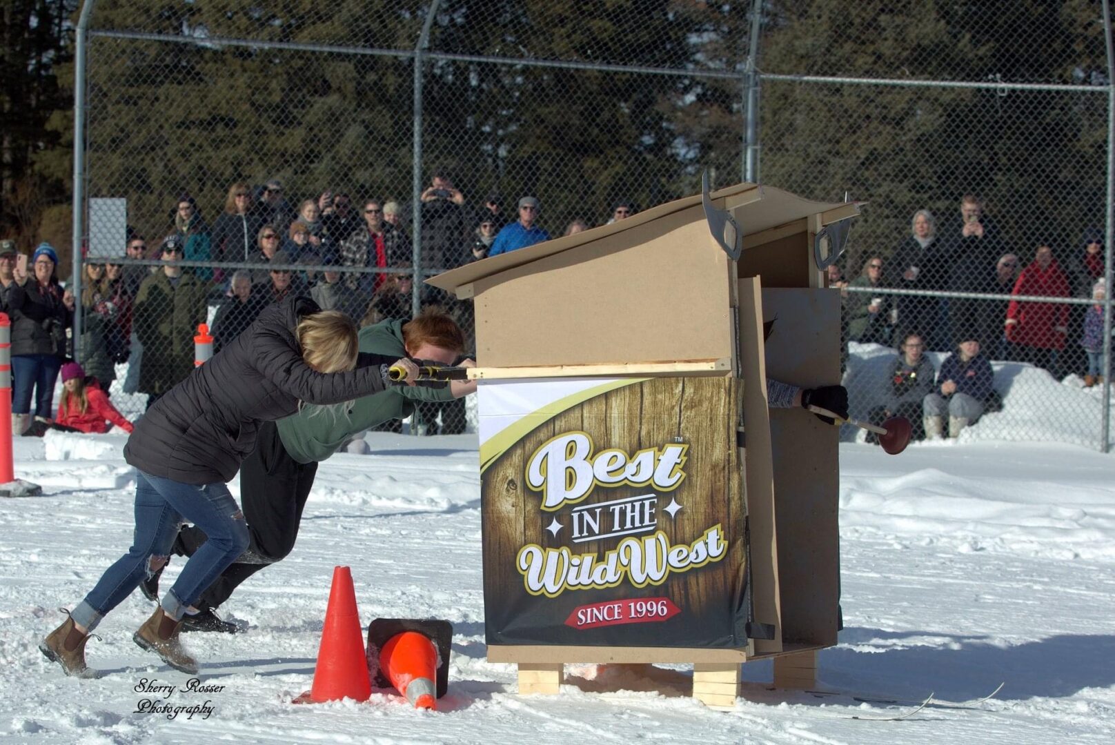 Competitors race in the men’s, women’s, or junior’s divisions in teams of three. Two teams race against each other at a time, with the object being to complete the course the fastest. The twist? Teams are pushing, or pulling, an outhouse on skis, while one of their teammates sits inside of it.