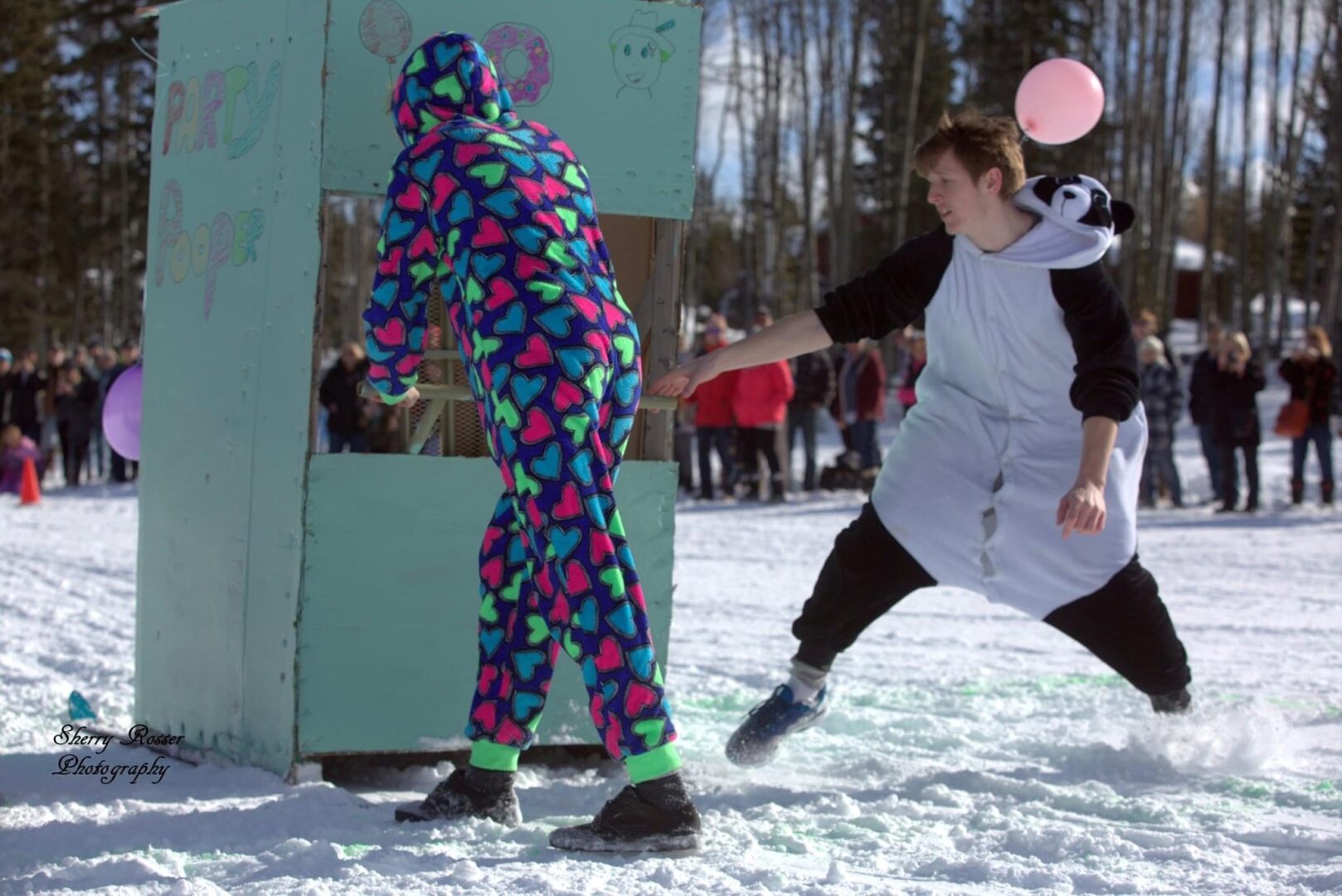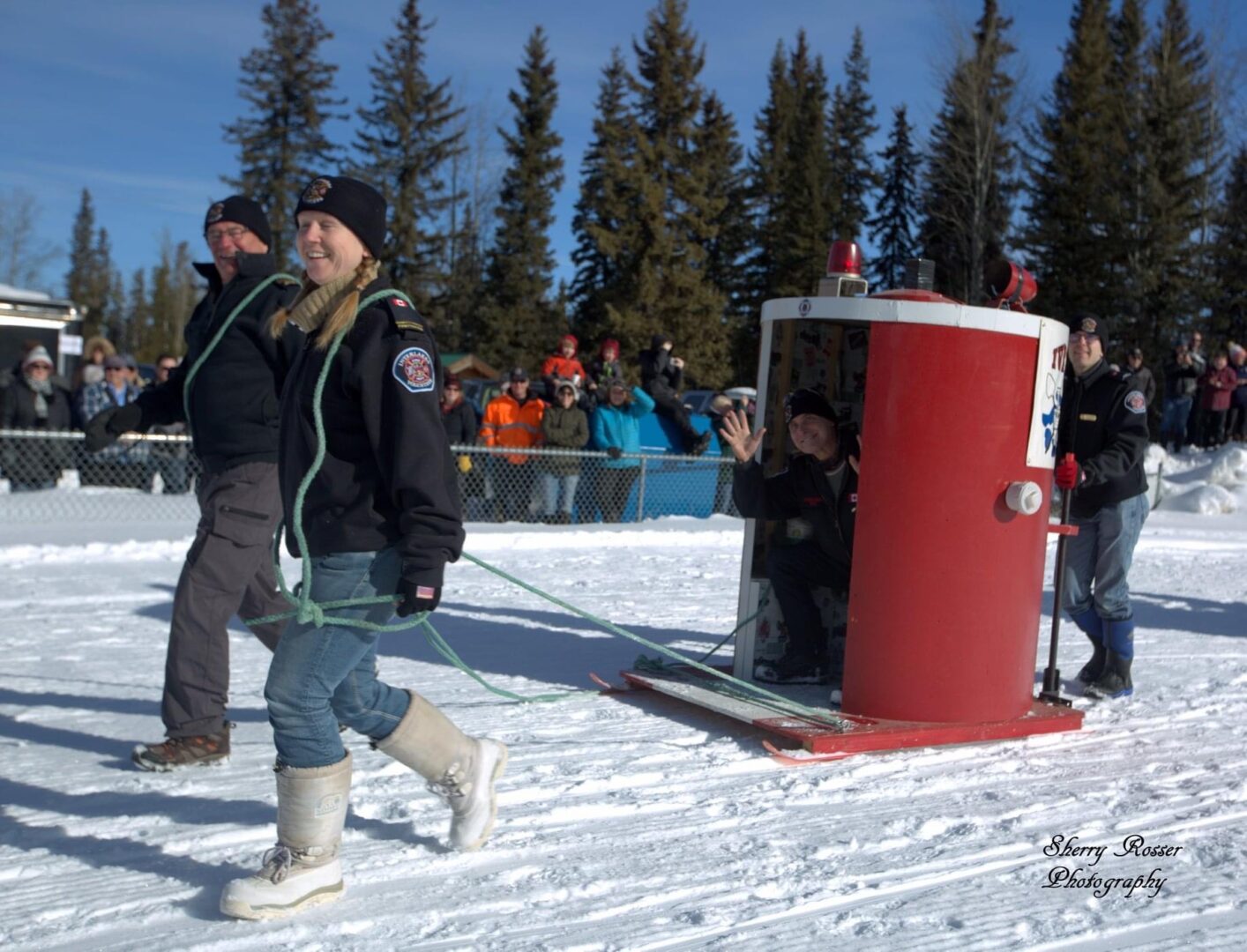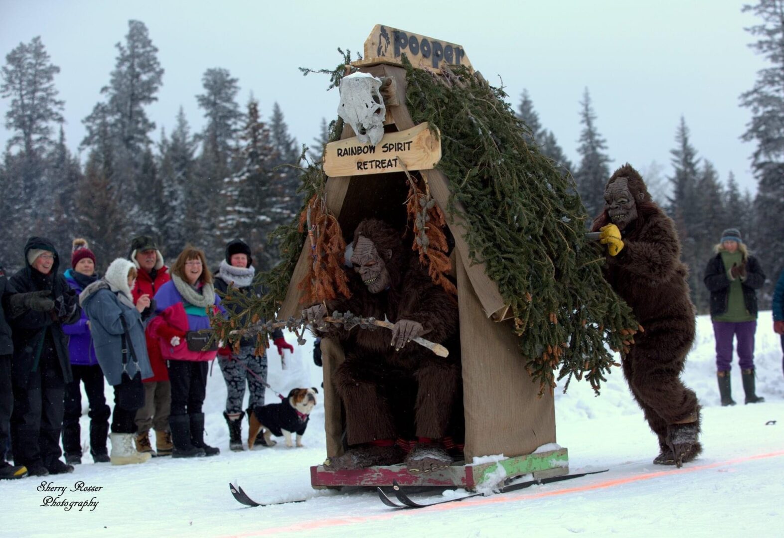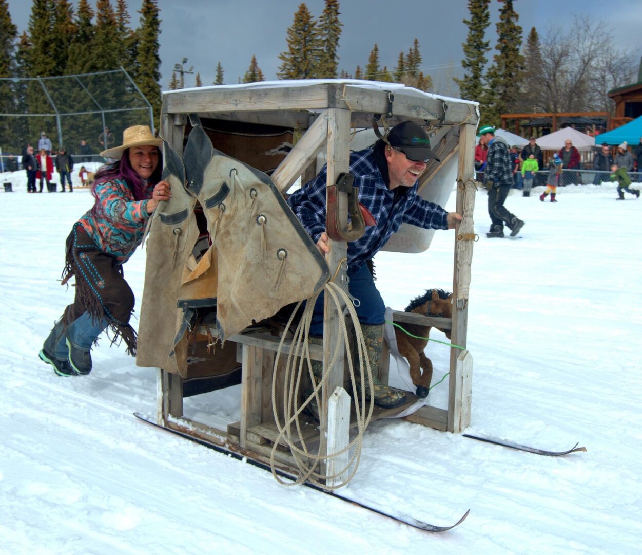 Competitors race in the men’s, women’s, or junior’s divisions in teams of three. Two teams race against each other at a time, with the object being to complete the course the fastest. The twist? Teams are pushing, or pulling, an outhouse on skis, while one of their teammates sits inside of it.