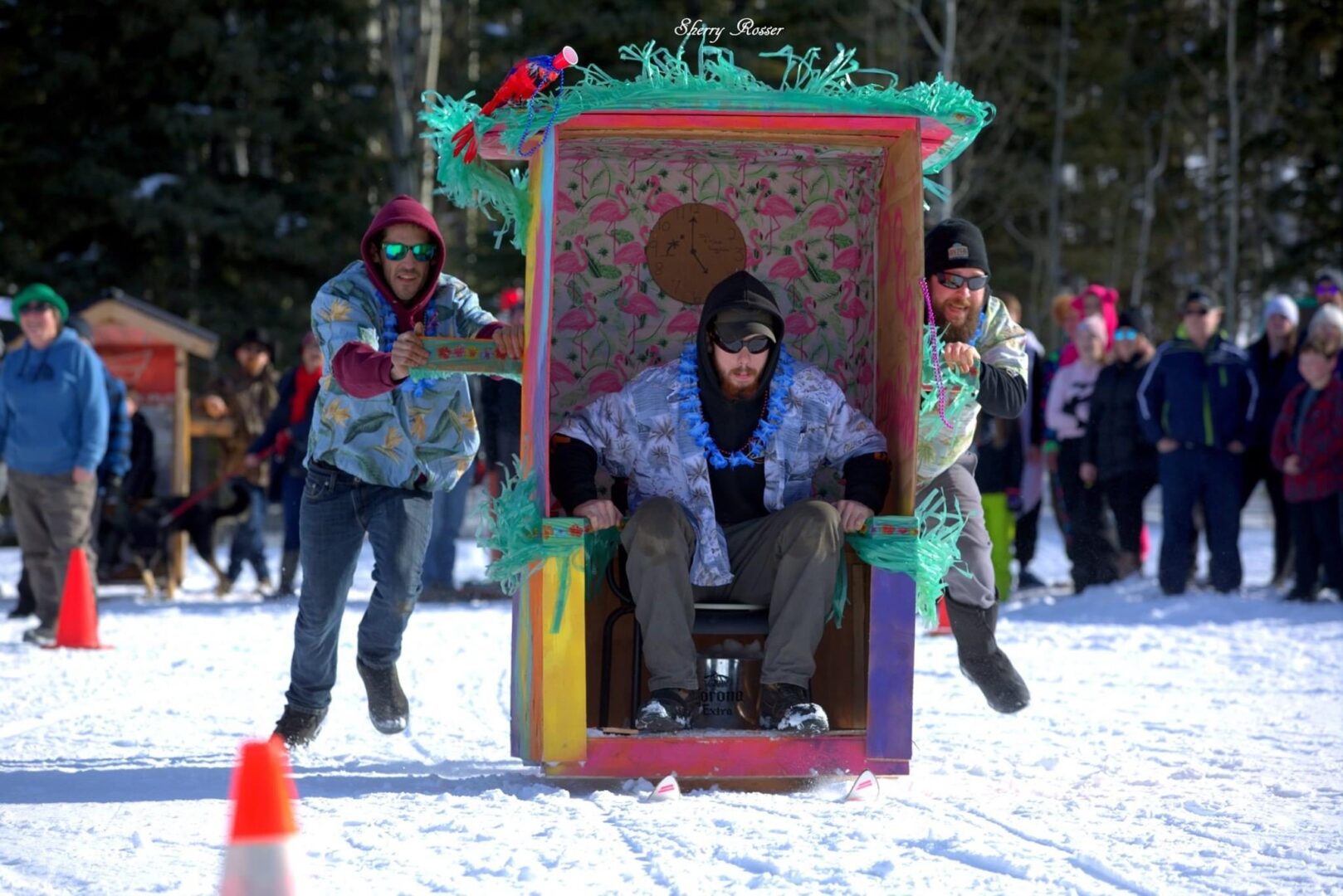 Sherry, whose family will likely compete this year as they’ve done in recent years, looks forward to the chance to gather as a community. “You see people that you haven’t seen in a few years. It’s just a really fun day… If you dress for the weather,” she adds. As an employee at the Sheridan Lake Resort, Sherry’s family races with the resort’s outhouse, “The Honey Wagon,” named after the septic pump truck that services the trailers that stay at the resort.