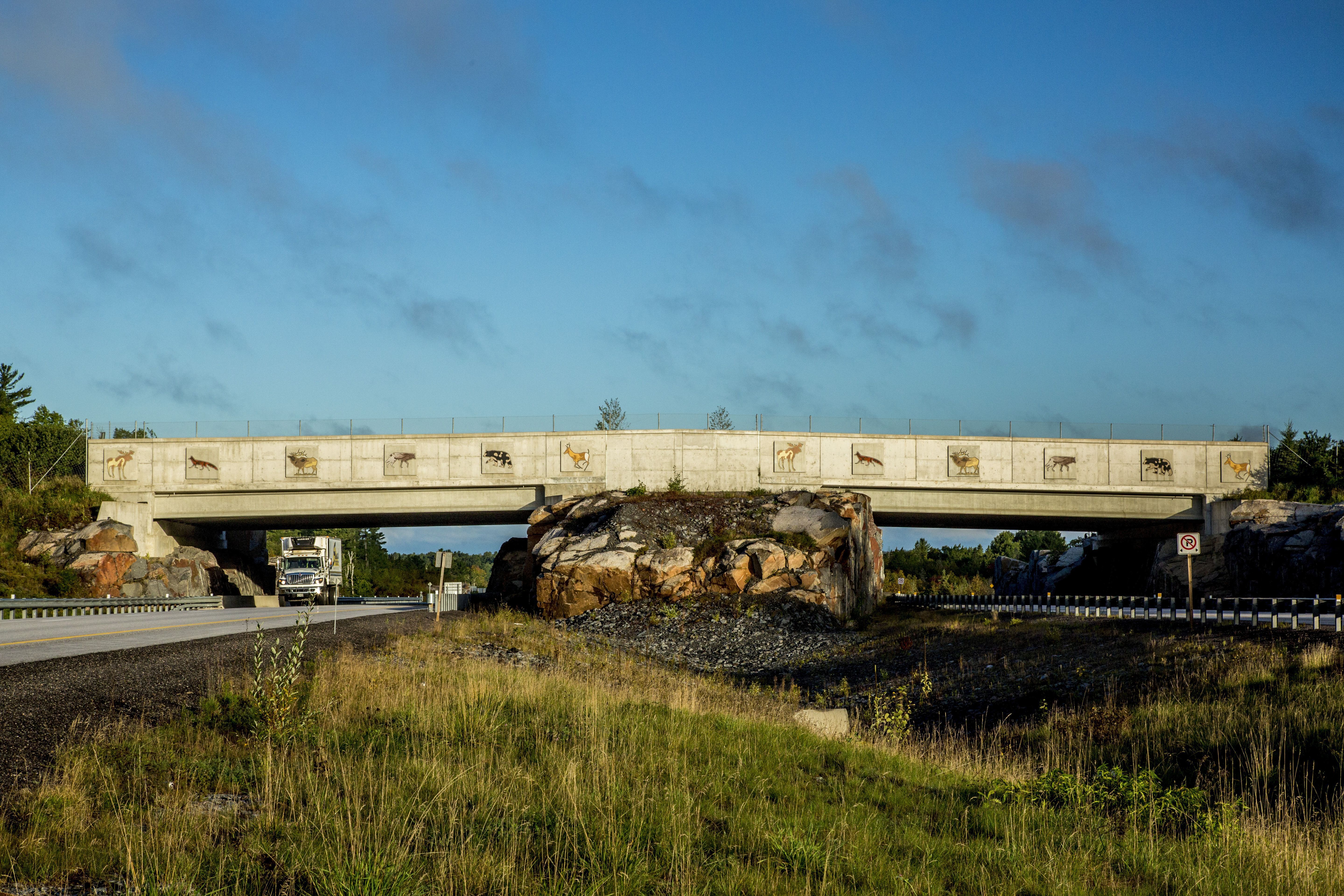 Drivers hitting Highway 69 north to Sudbury will inevitably find themselves crossing under a large stone overpass near Burwash, Ont., decorated with images of parading moose, bear, and foxes. This overpass is designed for wildlife, not people. Constructed in 2012, it’s part of a multi-pronged approach by the Ontario Ministry of Transport to prevent vehicle collisions with wildlife on the four-lane highway. The strategy includes not just the wildlife overpass but also several wildlife underpasses below the highway, and exclusionary fencing along the road to funnel animals to crossing structures.