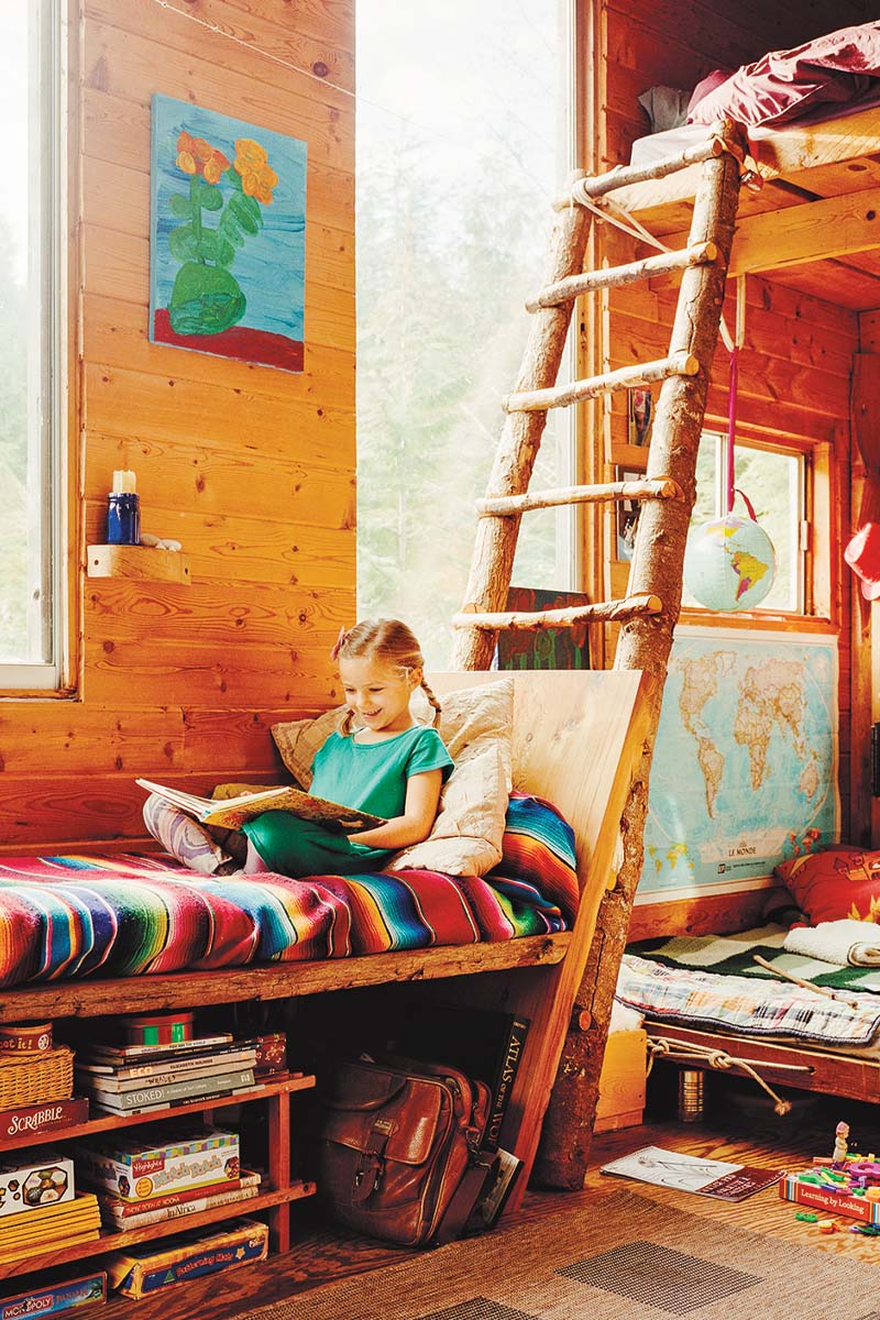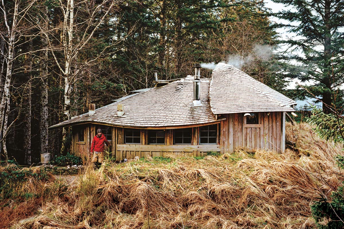 With “almost no building experience,” Pete built a 20-by-20-foot one-room cabin. It was bush building at its finest. “All I had was a hammer, a chainsaw, and a combination square. Pretty sure I had a level, but a really small one.” The clearing, which is backed by a skyline of old-growth forest in Naikoon Provincial Park next door, is tucked into a corridor of hemlock. A decade later, Pete’s spread now includes a stackwall bathhouse and a vegetable garden and serves as a weekend cottage during the school year for him, his wife, Laura, also a teacher, and their eight-year-old daughter, Layla. During the summers, they live out at the cottage and drive the 15 minutes back to their house in town to do laundry and (literally) recharge batteries.