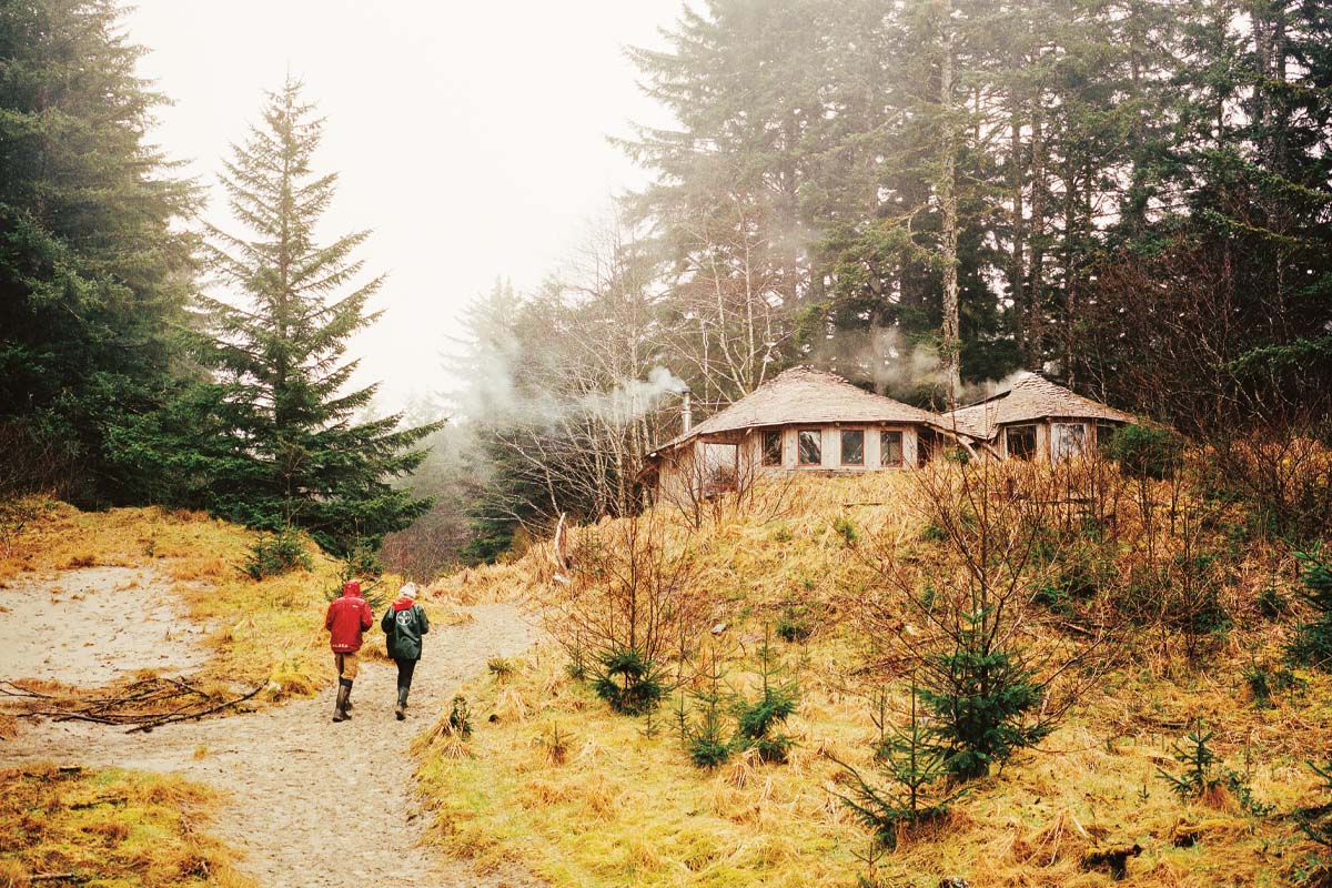 Richard performs yet another surf check; he leans slightly forward in his chair and peers to his right. While he’s there, he reaches into a bowl of cashews on the table. We’re in one of their two cabins, snugged together like the flesh around an apple core. The eyebrow-curved roofs of the two hobbit homes blend together as a natural cap to the sand dune. “I like that idea,” Richard says, “of not being on top of a hill, but being part of it.”